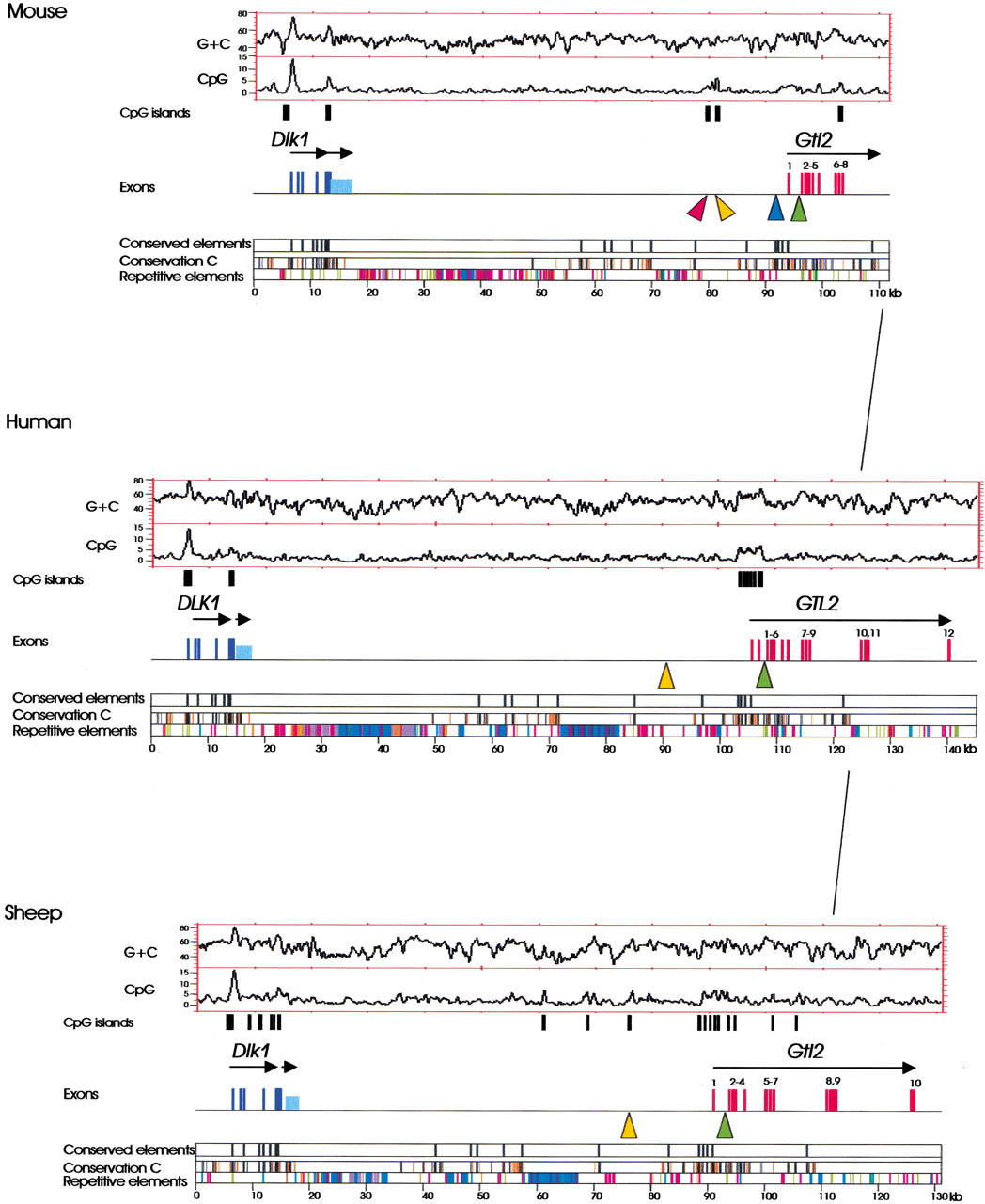 Conserved organization of the Dlk1–Gtl2 regions in mouse, human, and sheep. Above colored panels that describe sequence conservation and distribution of repetitive elements in the analyzed sequences, the structures of Dlk1 (dark blue), the transcript downstream of Dlk1 (light blue), and Gtl2 (red) are indicated by bars that represent exons. Arrows above the depicted exons indicate the orientation of gene transcription. (Conservation C) Conserved elements that are present in the mouse–human, sheep–human, mouse–sheep alignments. Elements that are identical in at least 40% of all positions (>40 bp in length, aligned without gap) are shown in orange, elements that are identical in at least 70% of all positions are shown in black (>40 bp, aligned without gap). (Conserved elements) Elements that are aligned without gaps, identical in at least 70% of all positions, and at least 100 bp long. (Repetitive elements) LINE elements (blue); SINE elements (red); LTR elements (purple); DNA elements (orange); small RNAs (grey); satellites, simple repeats, low complexity DNA (green). (Orange triangles) Conserved CpG-rich repeats; (red triangle) nonconserved CpG-rich repeat; (blue triangle)lacZ integration site; (green triangles) conserved putative CTCF-binding sites. The overall G+C and CpG densities (window size 500 bp, values given as percentages) are presented as plots. CpG islands identified by the CpG plot software (http://www.ebi.ac.uk/index.html) are shown as black bars below the plots.