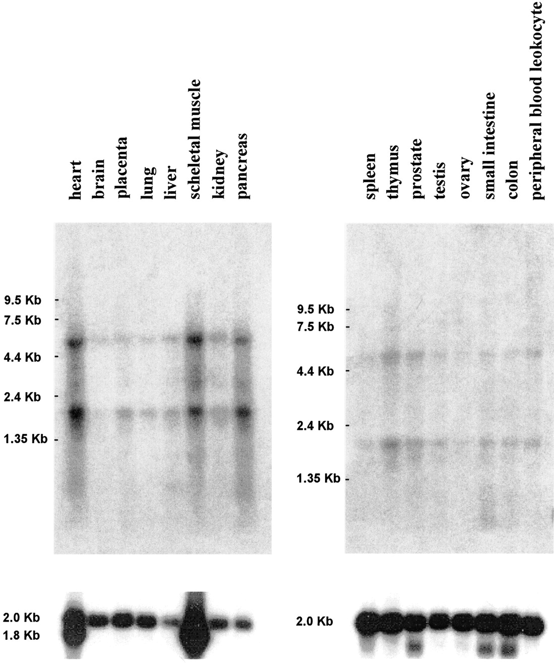 Gene expression of DHRSXY in human tissues. The bars on the left indicate the position of migration of RNA markers. Reprobing of the same filter with a β-actin probe is shown in the bottom panel.