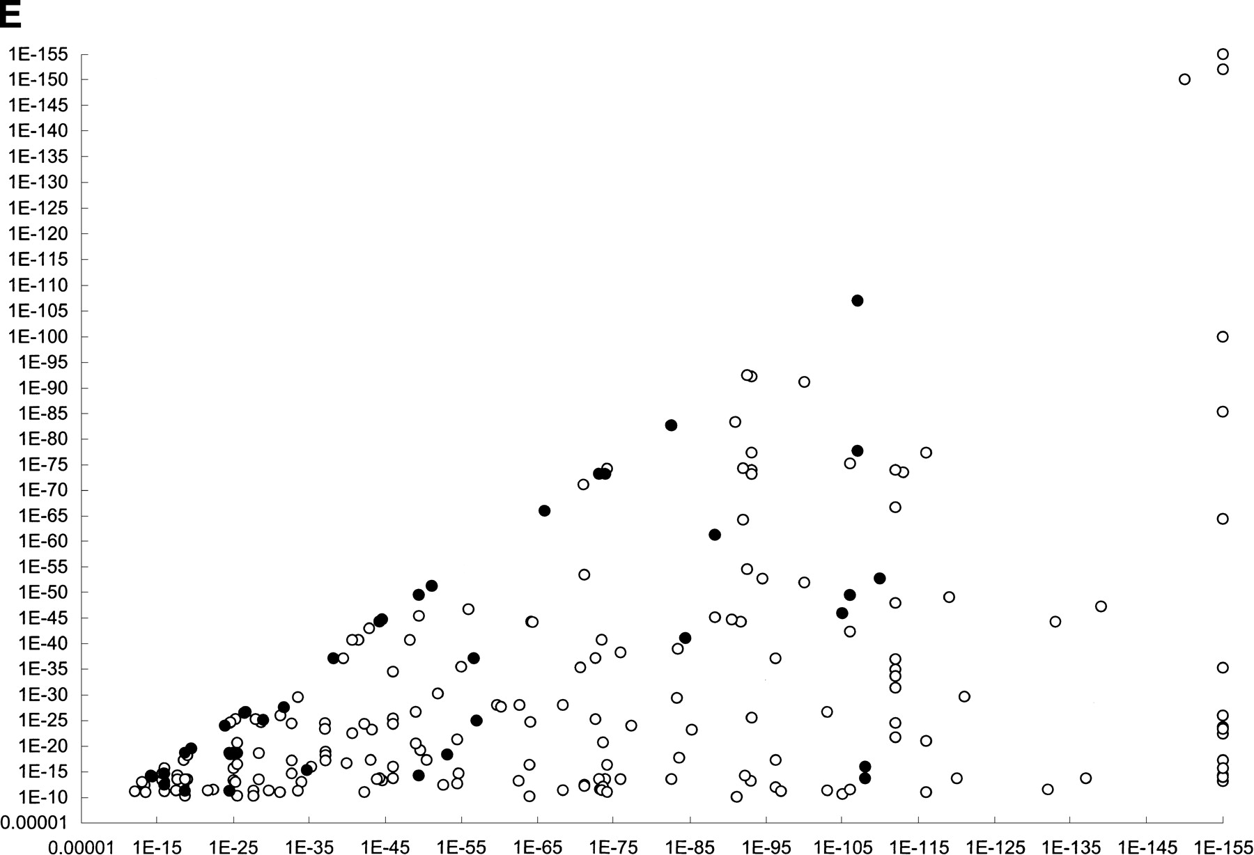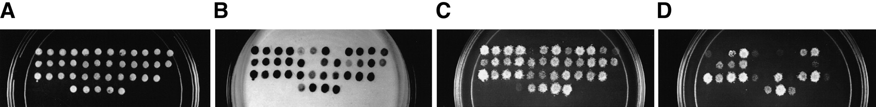Experimentally verified interactions between Saccharomyces cerevisiae and Caenorhabditis elegans. (A–DYeast diploid cells expressing each of 35 C. elegans potential interologs. Pairs are arranged in the order described in Table 2. The five patches at the bottom are controls (negative control on the left side and controls of increasing interaction strength towards the right side). See Vidal (1997) for a detailed description of these controls. (B) β-Galactosidase assay to detect the expression ofGAL1::lacZ. (C) Growth assay on SC-Leu-Trp-His, +20 mM 3AT plates to detect the expression of GAL1::HIS3. (D) Growth assay on SC-Leu-Trp-Ura plates to detect the expression of SPAL10::URA3. (E) Conservation of interactions. Each C. elegans protein pair tested was plotted according to two E-values. The first E-value corresponds to the conservation between the X (from yeast) and X‘ (fromC. elegans) proteins while the second E-value corresponds to the conservation between the Y (from yeast) and Y‘ (fromC. elegans) proteins. The smaller of the twoE-values was plotted on the X-axis and the greater on the Y-axis. The C. elegans protein pairs that tested positive in the two-hybrid system are labeled in black.