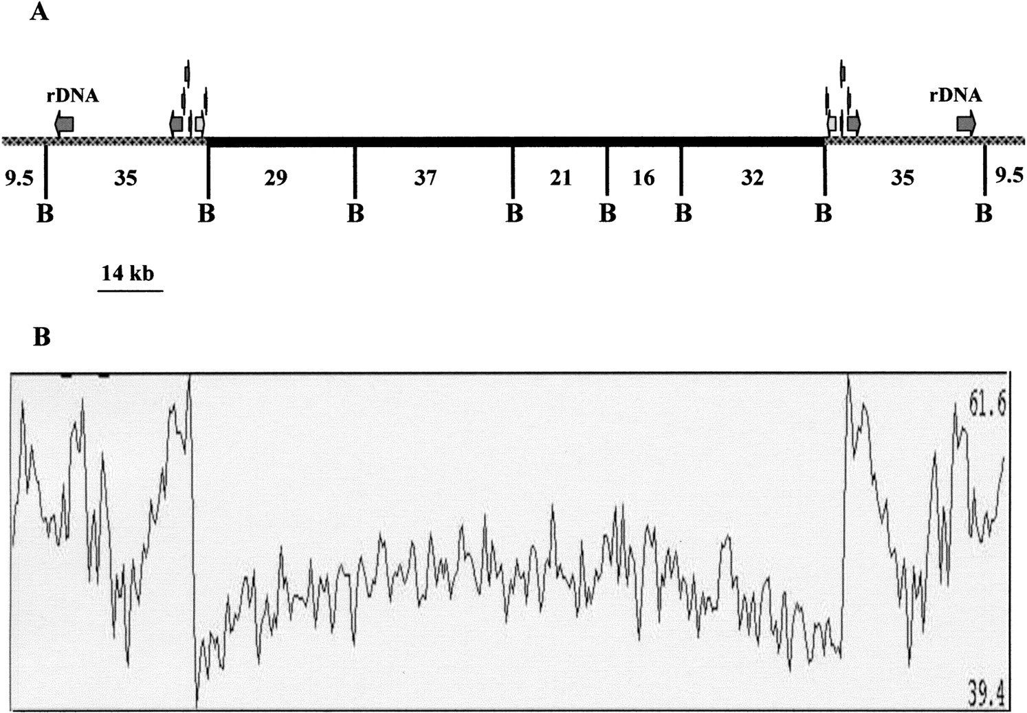 Scheme of Encephalitozoon cuniculi chromosome I organization. (A) The symmetrical organization of chromosome extremities, the location of the two rDNA transcription units in the subtelomeric region (gray), and the presence of a six putative CDSs duplication at the junction of the core and subtelomeric region (see Results) are illustrated. The central black trait depicts the core region composed mostly of unique genes. B represents BssHII restriction sites used for physical mapping and sequence confirmation in this study. (B) G + C percentage along the chromosome calculated in a 500-nt window with 100-nt progression increments. The highest and lowest G + C percentage are shown on the right of the panel.