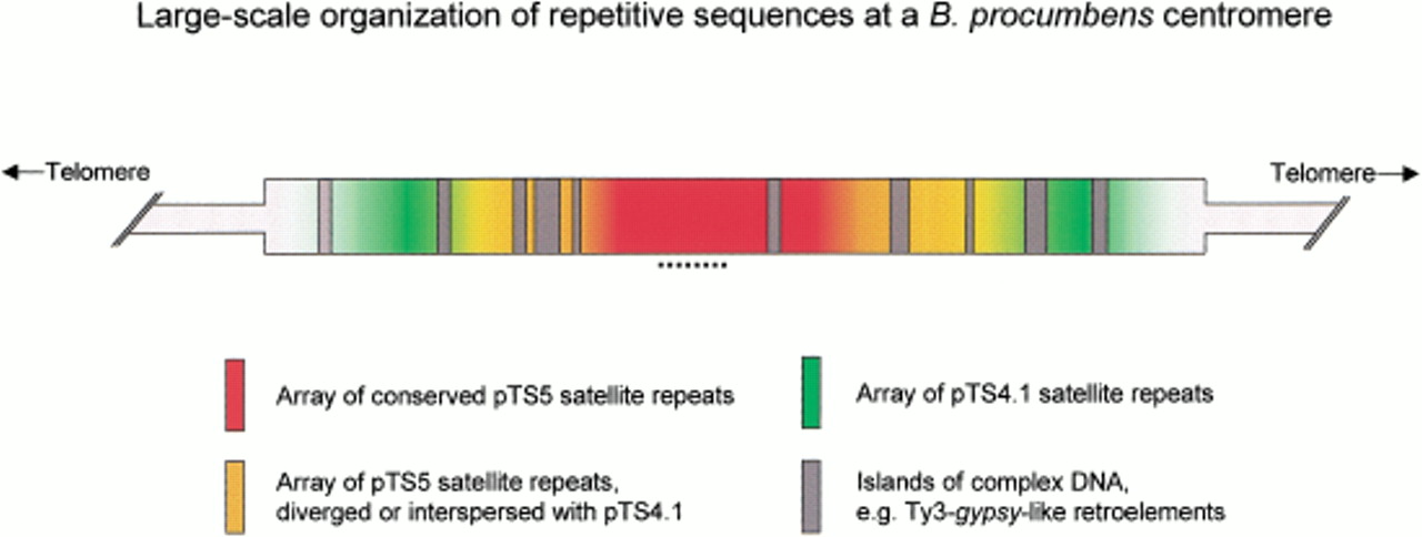 A model of the organization of repetitive DNA sequences at a Beta procumbens centromere. Major satellite families are represented by different colors. The region containing the presumable chromosomal breakpoint that results in the PRO1 minichromosome is indicated by a dotted line. Not included are microsatellite sequences, such as GATA.