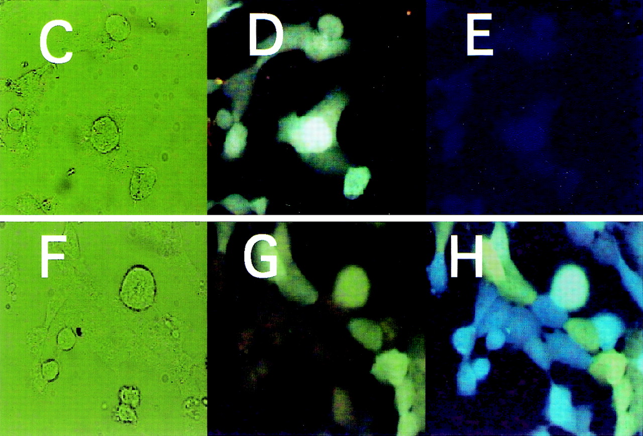 Structure and expression of the double-labeled GFP plasmid system. (A) The pIS integrating sphGFP vector. (B) TheHPRT1-tpzGFP survival plasmid. P-CMV, P-TK, and P-RSV indicate the promoters of herpes TK1, CMV, and RSV, respectively. IVS represents the rabbit globin second intron. PA stands for polyadenylation signal. Solid arrows indicate open reading frames translated in the transduced human cells. (C–E) HIS4 cells expressing the pIS construct. (F–H) Clone 12 cells that express both the sphGFP from the pIS construct and tpzGFP from the episomal survival plasmid. PanelsC and F are photographs of the phase image. Fluorescent images in panels D,E,F, andG were obtained using filter sets that preferentially detect sphGFP (D,G) or tpzGFP (E,H). The Clone 12 cells were maintained in hygromycin B selection to retain the survival plasmid.