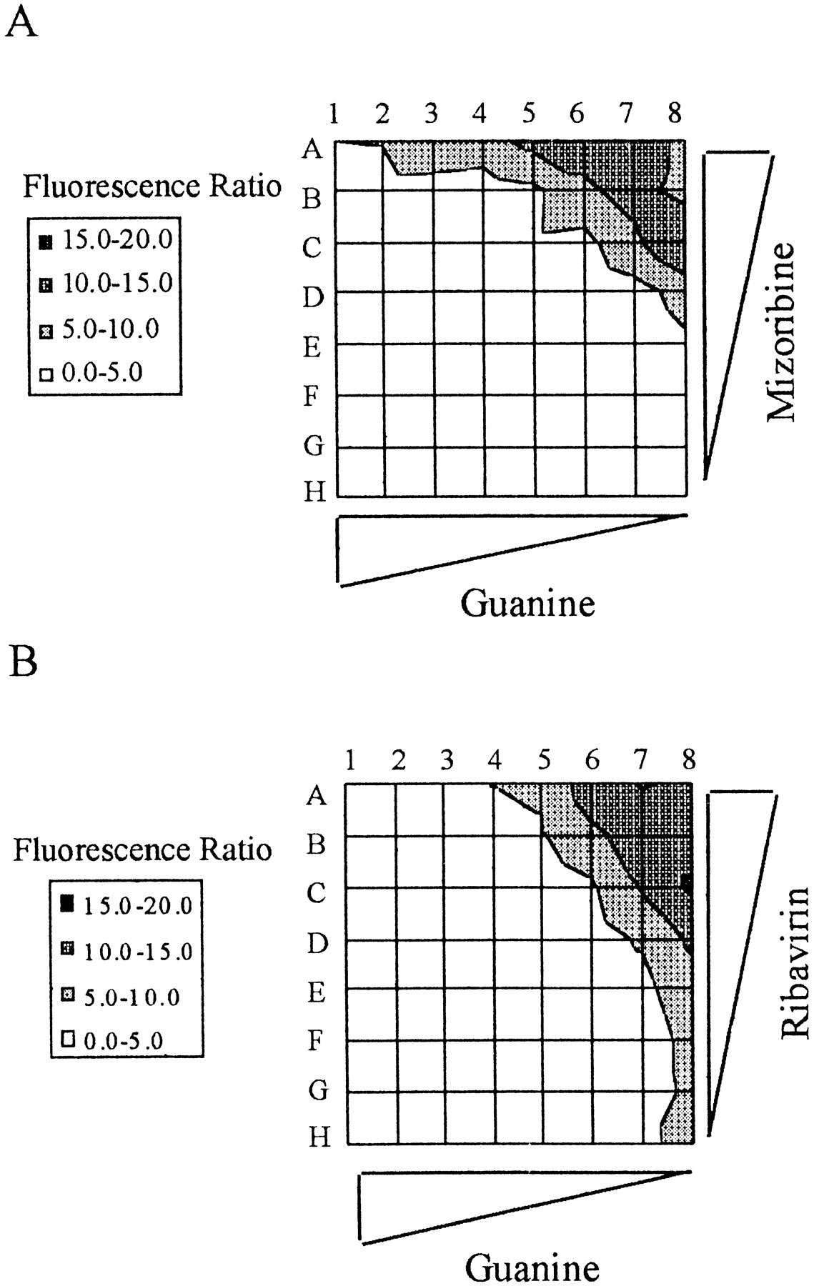 Chemical synthetic lethality induced by nucleoside analog inhibitors of IMPDH. Clone 12 cells were grown in microplates in the presence of mizoribine (A) or ribavirin (B) for a period of 3 wk before measurement of fluorescent ratio. Values for the fluorescent ratios are shown on the left. Rows A–H, in each matrix, represent the inhibitory drug data. Guanine was at 400 μM in column 1, and serial dilutions were in the indicated direction. In (A), mizoribine was at 400 μg/mL in row A and serial dilutions were in the indicated direction. In (B), ribavirin was at 200 μg/mL in row A and serial dilutions were in the indicated direction.