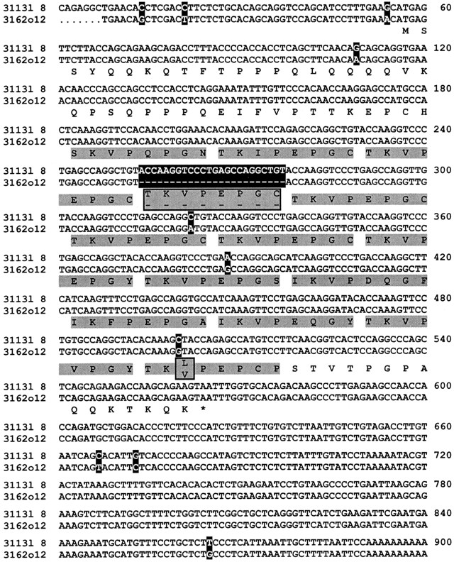 Alignment of the cDNA clones 31131 8 and 3162o12 representing two different alleles of the SPRR3 gene. Black boxes indicate divergences in the nucleotide sequences, open boxes indicate divergences in the deduced amino acid sequences that contain 14 (clone 31131 8) and 13 (clone 3162o12) octapeptide repeats (shaded gray), respectively. Among the four mutations within the coding region, only one results in a substituted amino acid residue, with higher homology to the consensus repeat sequence TKVPEPGC of clone 3162o12.