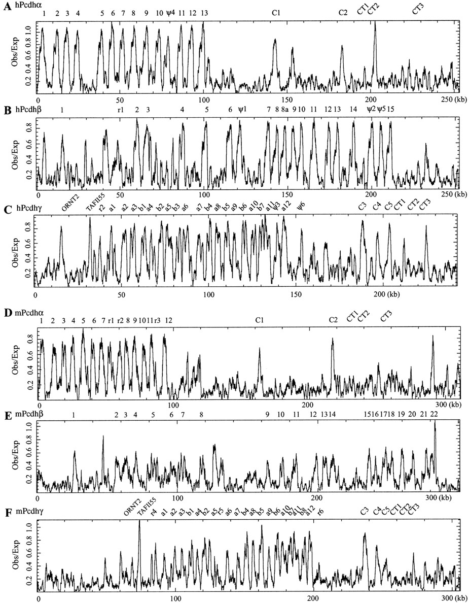 Distribution of CpG islands in the genomic sequences of human and mouse protocadherin gene clusters. Shown are ratios of observed to expected CpG dinucleotide frequency of a 1000 bp sliding window in the region of human Pcdhα (A), Pcdhβ (B), and Pcdhγ (C) and mousePcdhα (D), Pcdhβ (E), andPcdhγ (F) gene clusters. The peak of ratios correlates with the position of protocadherin variable region exons but not constant region exons. The position of each variable and constant region exon is indicated at the top of each panel. (CT), constant region exon.