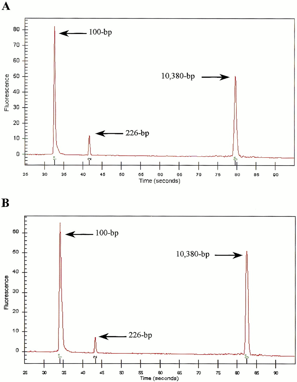 (A) Electropherogram of human coagulation Factor V amplification in the plexiglas microchip module with a PCR microchip containing 1000 WBCs isolated by the conventional test tube method from human whole blood. (B) Electropherogram of human coagulation Factor V amplification by integrated cell isolation and PCR in the plexiglas microchip module.