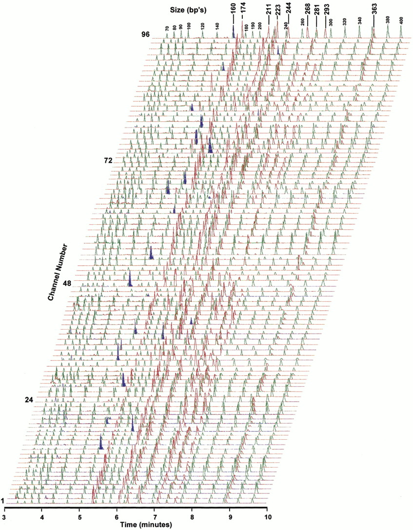 Ninety-six CEPH samples genotyped for three HHC-associated variants simultaneously on a 96-channel radial CAE microplate. The numbers at the top of the electropherograms indicate the standard and amplicon sizes in bp. Electropherograms were aligned to match the 70 bp and 400 bp flanking standards. Samples with mutant alleles are easily identified by the presence of the extra R110 (blue) peaks at 160, 201, and 232 bp (63D-187g, 65C-193t, and 282Y-845a alleles, respectively).