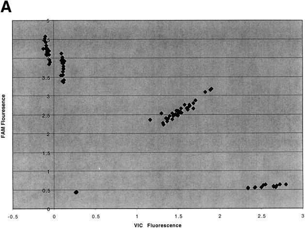 Scatter plot of the results of 5′-nuclease assay with marker D2S1301 on 90 individuals. (A) Fluorescence intensity analysis. (B) Normalized fluorescence polarization analysis.