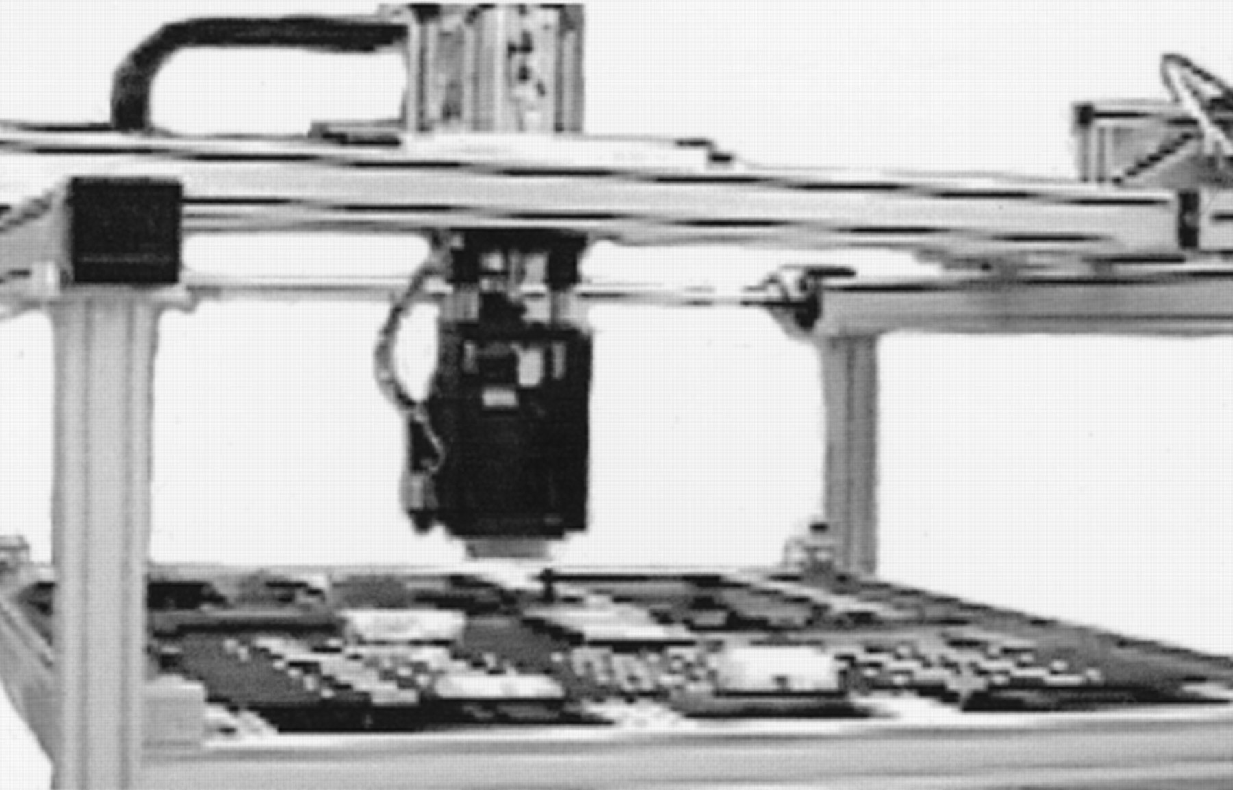 96-channel automated pipettor and workspace. The pipettor is attached to an XYZ gantry, which gives it the capability to pick up disposable tips, load them with reagents, and insert them into the 96-channel cycling block, all of which are located on the workspace area.