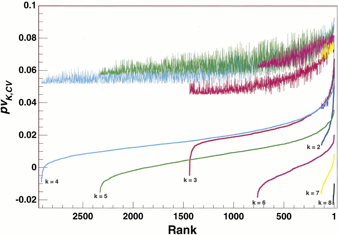 Plot of the cross-validated proportion of variability explained by the 7710 retained sets of genotypic partitions. The sets are sorted by the proportion of variability explained and connected by a colored line corresponding to the number of partitions in each set (smooth, nondecreasing lines). The proportion of variability explained for each set before cross-validation is shown by the jagged lines of corresponding colors.