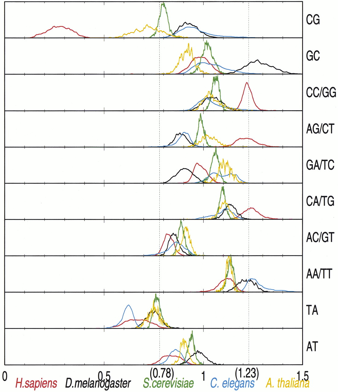 Distribution of ρ* values for all 50-kb samples from human (red),Drosophila melanogaster (black), Saccharomyces cerevisiae (green), Caenorhabditis elegans (blue), andArabidopsis thaliana (orange).