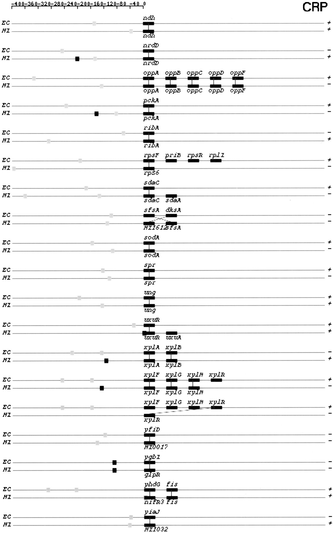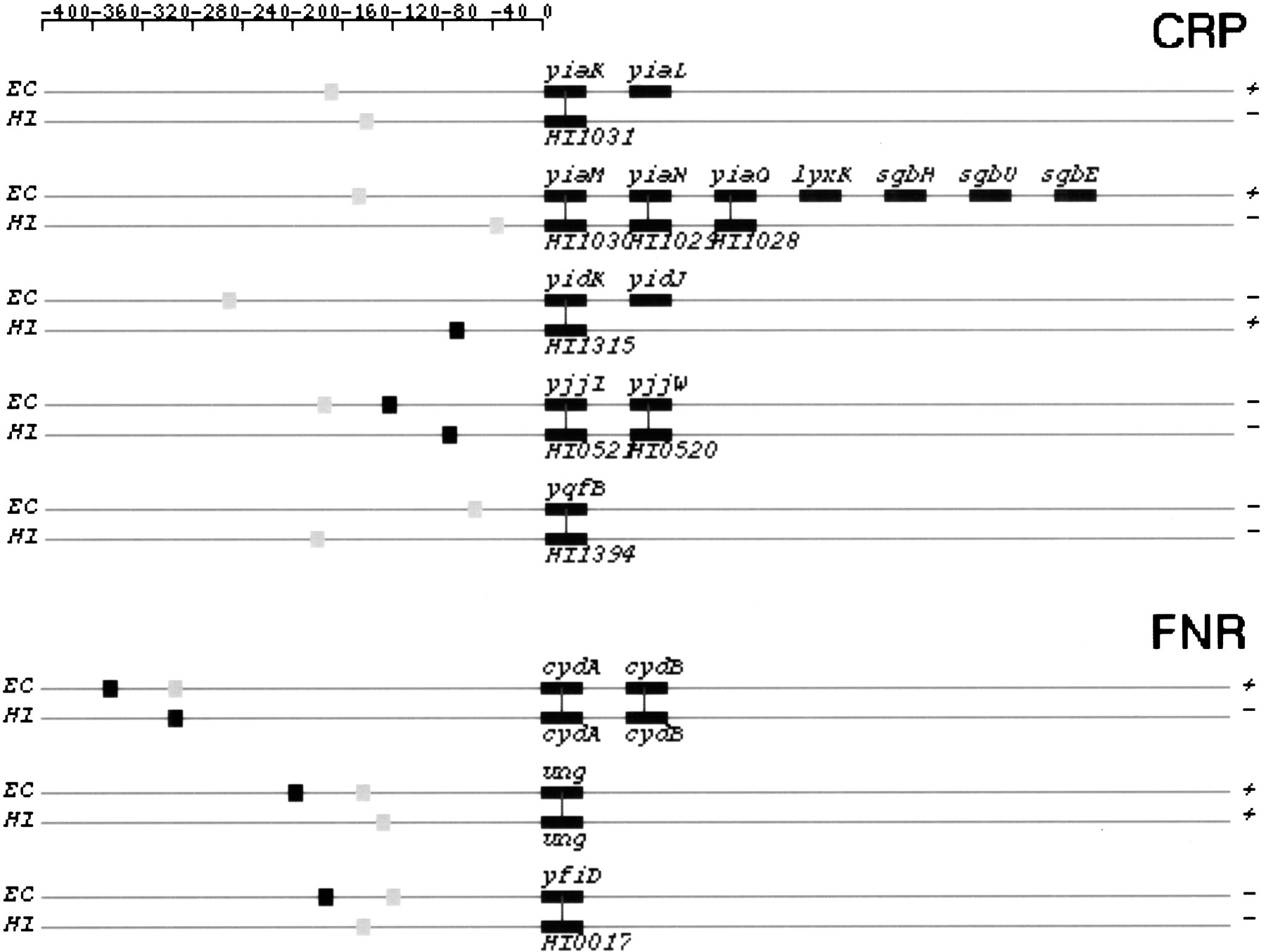 Orthologous TU pairs from categories I and IIA that are predicted to be regulated by CRP and FNR. CRP-regulated TUs are shown first followed by FNR-regulated TUs. Symbols and drawing schemes are as described for Figure 6. CRP, cAMP receptor protein; FNR, fumarate and nitrate reduction regulatory protein.