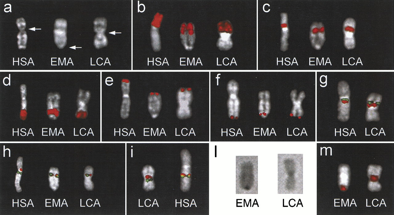(a) Q-banded chromosome X from Homo sapiens (HSA),Eulemur macaco (EMA; black lemur), and Lemur catta(LCA, ringtailed lemur). The arrows indicate the centromere. EMA and LCA chromosomes are oriented, in all images, upside-down to match the orientation of human X. (b–f) Examples of fluorescence in situ hybridization (FISH) experiments using PCP #364 (Xp; b), PCP #377 (Xp11.2–Xp11.3; c), PCP #118 (Xq24–28;d), PCP #PGPL probe (PAR1; (e), and U130F6 cosmid clone (HSPRY3 gene, PAR2; f). (g) Cohybridization experiment using probes bA235K20 (green signal) and dJ1015G2 (red signal). Their orientation is identical in both species. (h) Probes dJ598A24 (red) and bA235K20 (green) flank the human centromere. In EMA and LCA, they appear to be almost completely overlapping. (i) Probes dJ1015G2 (red) and dJ715D6 (green) surround the LCA centromere and are well separated by the centromeric heterochromatin. In HSA, they appear much closer. (l) The C-banded chromosome X of EMA and LCA. (m) The signal of DOP-PCR amplified products from microdissected material of the EMA (left) and LCA (right) centromeric regions hybridized to EMA and LCA metaphases, respectively. Only chromosome X is shown (see text for details).