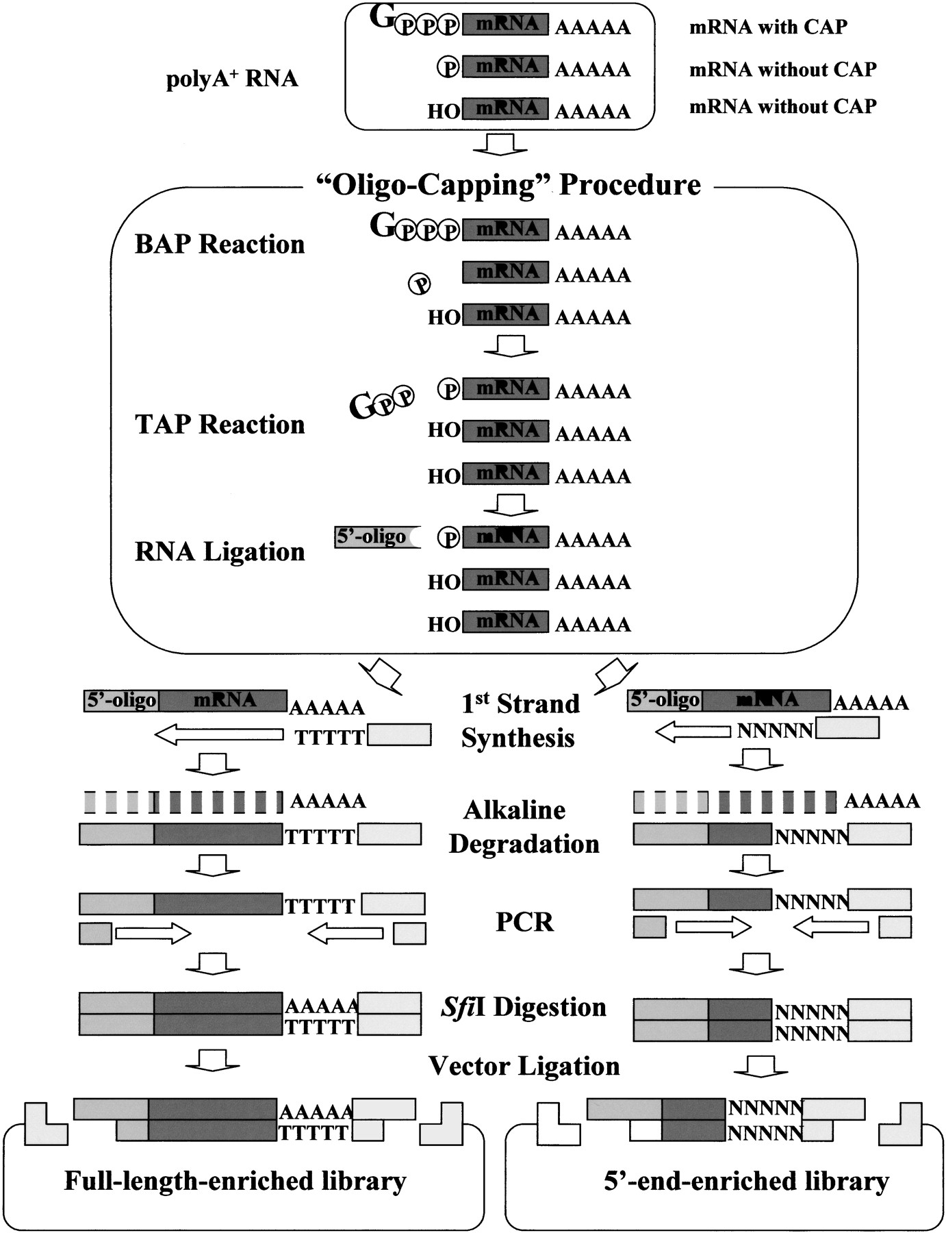Schematic representation of the construction of oligo-capped cDNA libraries. The cap structure of the mRNA was replaced with the 5′ oligonucleotide by the oligo-capping method, which consists of three enzymatic reaction steps. Bacterial alkaline phosphatase (BAP) hydrolyzes the phosphate of the 5′ ends of truncated mRNAs whose cap structures have been degraded. Tobacco acid pyrophosphatase (TAP) removes the cap structure, leaving a phosphate at the 5′ end. T4 RNA ligase, which requires a phosphate at the 5′ end as its substrate, selectively ligates the 5′ oligonucleotide to the 5′ end that originally had the cap structure. Using oligo-capped mRNA, first-strand cDNA was synthesized with dT adapter primer. After alkaline degradation of the RNA, first-strand cDNA was amplified by PCR, digested with restriction enzyme SfiI, and cloned into a plasmid vector. For further details of the procedure, see references (Suzuki et al. 1997,2000). RNA and DNA molecules are represented by dark gray bars, the 5′ oligonucleotide by light gray boxes, and PCR primers by broken bars. (Gppp) Cap structure, (p) phosphate, (OH) hydroxyl.