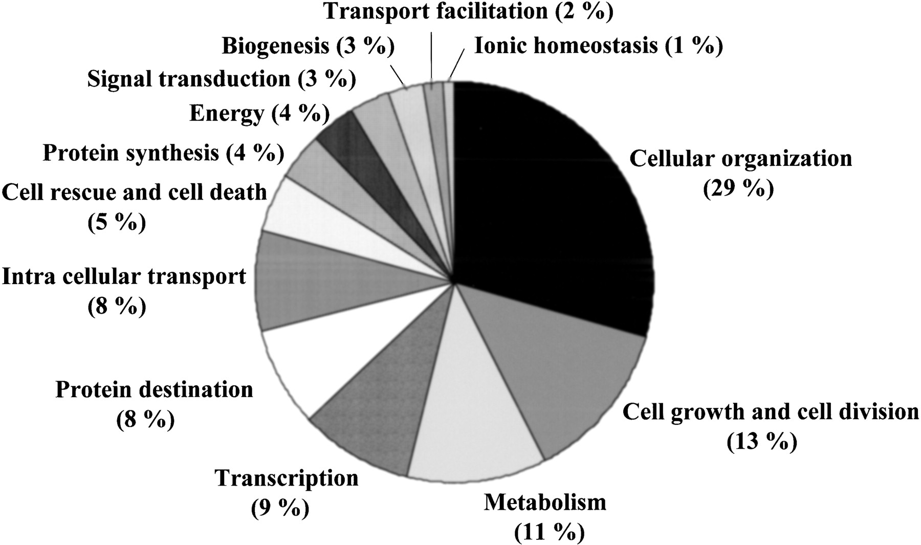 Functional classification of the potential promoter regions (PPRs). The promoters were classified according to which functional category the corresponding genes had been assigned in Human Info Base (HIB;http://www.mips.biochem.mpg.de/proj/human/selec_view.html). The functional categories and population of the genes belonging to each category are shown.