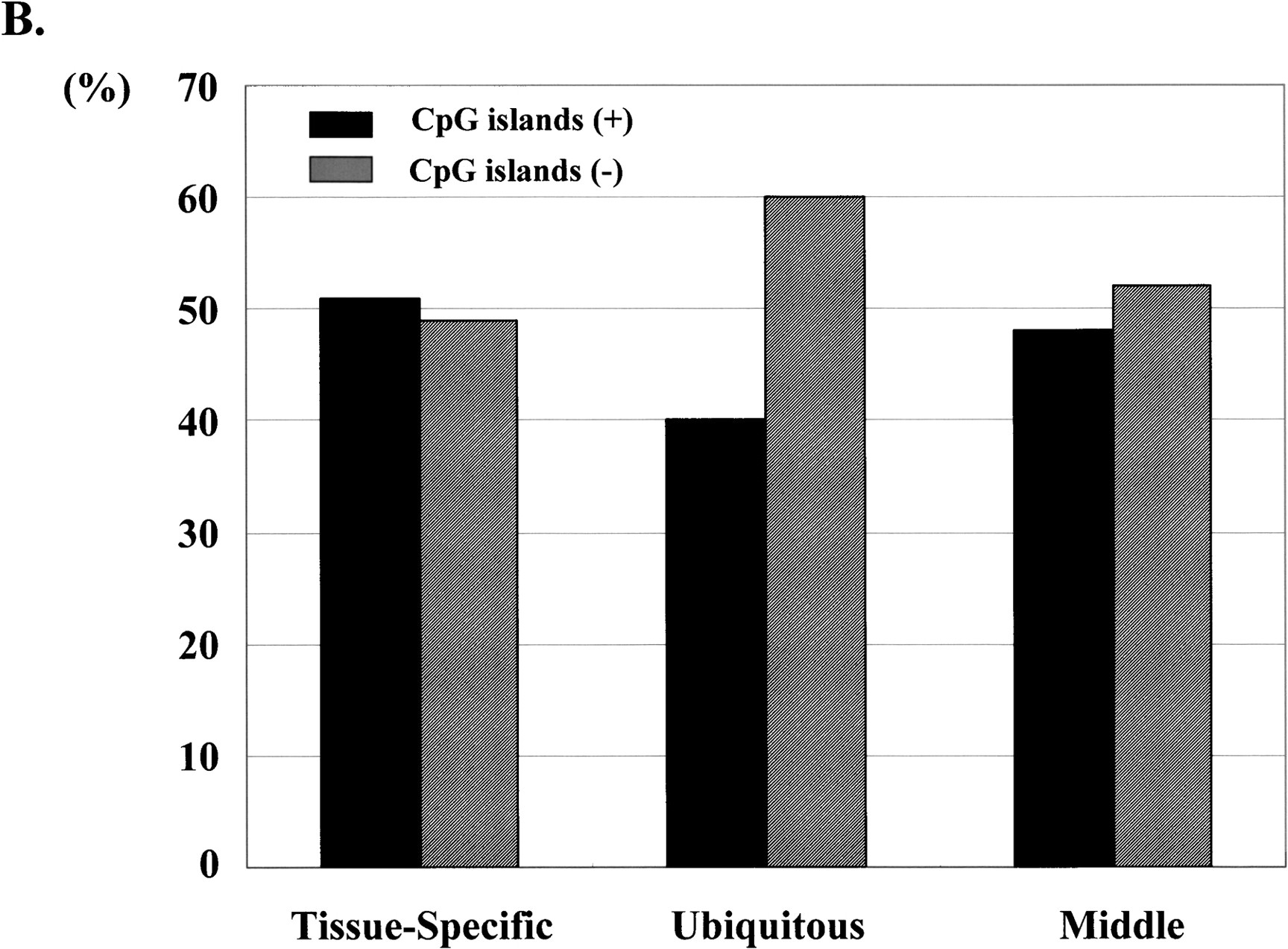 (A) Expression profiles of chitinase 3-like 1(GeneRank no. 1), lipoamide beta(GeneRank no. 35), SUPT4H1(GeneRank no. 316), and mitochondrial-processing peptidase beta (GeneRank no. 350) observed by iAFLP. Vertical axes represent the relative expression level; horizontal axes represent the tissue distributions. The expression level was designated so that the total values should be 30. (B) Populations of tissue-specific, ubiquitous, and middle genes located in/outside of CpG islands. Solid bars represent population of potential promoter regions (PPRs) located in CpG islands; shaded bars represent PPRs outside of CpG islands.