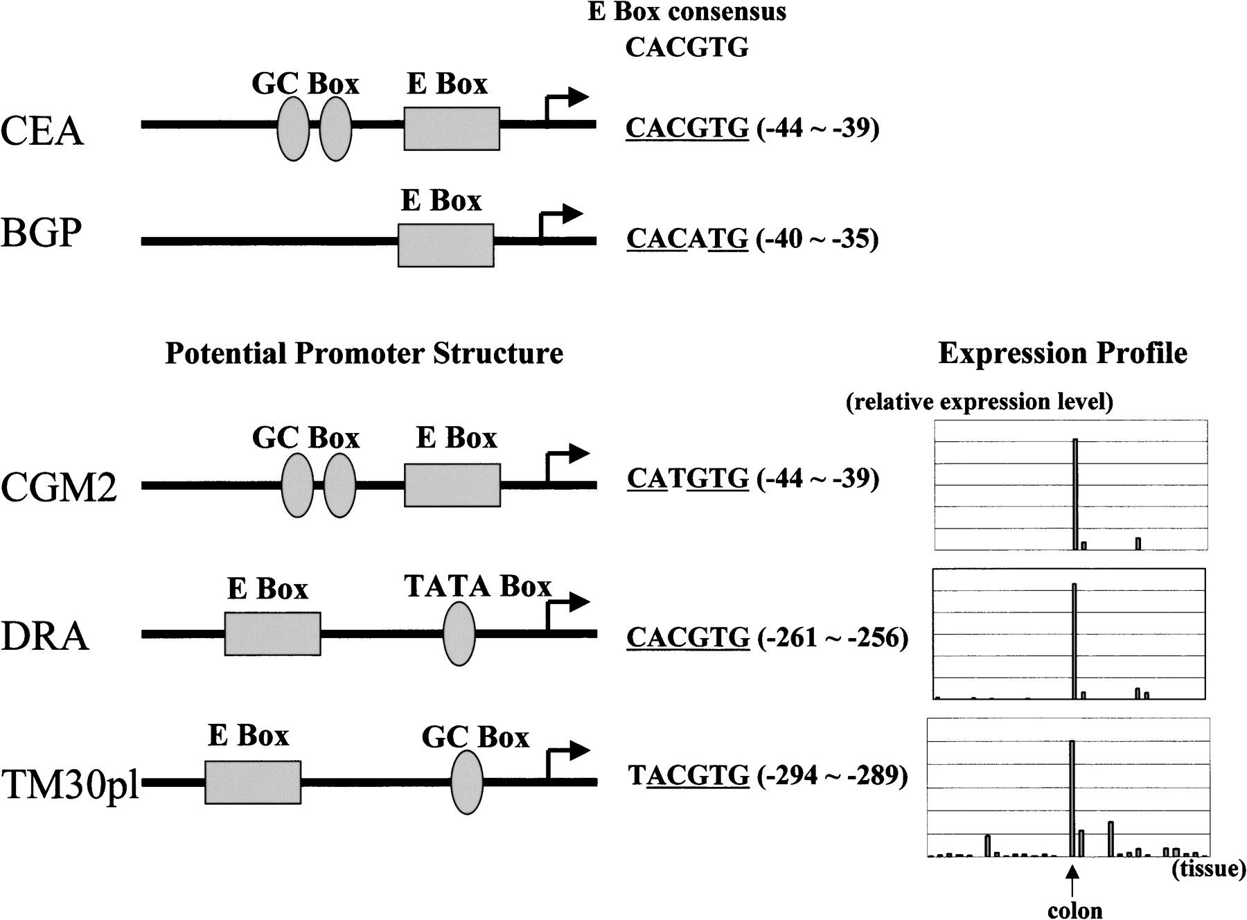 Potential promoter structures and expression profiles of theCGM2 gene, the DRA gene, and theTM30pl gene are shown. The promoter structures were predicted from corresponding potential promoter region (PPR) sequences using TFBIND. Previously reported promoter structures of the CEA gene and the BGP gene are shown attop. Consensus sequence of E box and the sequences of predicted E boxes are shown to the right of the promoter structures. The nucleotides that match the consensus sequence are underlined. Each position of the predicted E box is also shown. The expression profile observed by iAFLP is shown at right for each gene (for more details, see http://bodymap.ims.u-tokyo.ac.jp).