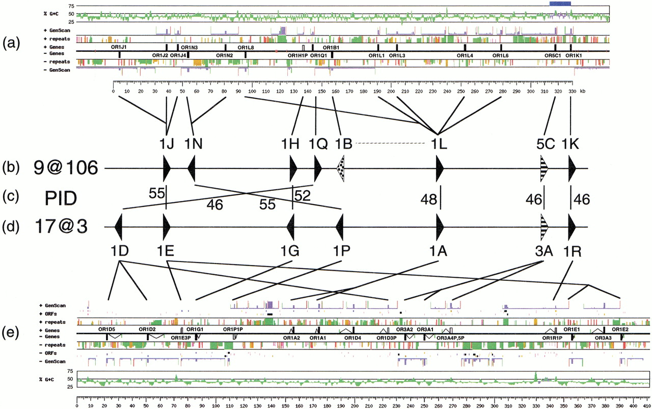 Sister-cluster evolution: Comparison between clusters 9@106 and 17@3. (a) GESTALT map of cluster 9@106, including graph of G + C content, GenScan predictions, interspersed repeats, and kilobase scale. Vertical gray lines indicate sequencing gaps. The order and orientation of the OR-containing contigs is final. Closed boxes represent intact ORs, and the open box indicates an OR pseudogene. The blue bar on top of the G + C content graph indicates an ∼10-kb segment surrounding OR5C1 , with G + C content corresponding to an H1 isochore. (b) Subfamily reconstruction of the 9@106 cluster at the postulated time of divergence from cluster 17@3. The dotted triangle indicates the single subfamily (1B) for which a counterpart was not observed. This subfamily is most similar to subfamily 1L, present in the same cluster, and may represent a gene duplication or deletion event that happened immediately after the cluster duplication. (c) Protein identity (PID) levels for each pair of subfamilies. (d,e) Subfamily reconstruction and GESTALT map of the 17@3 cluster, adapted from Glusman et al. (2000b), shown here in the opposite orientation. The recombinatorial events leading to the generation of OR1D4 and OR3A3 were omitted for clarity.