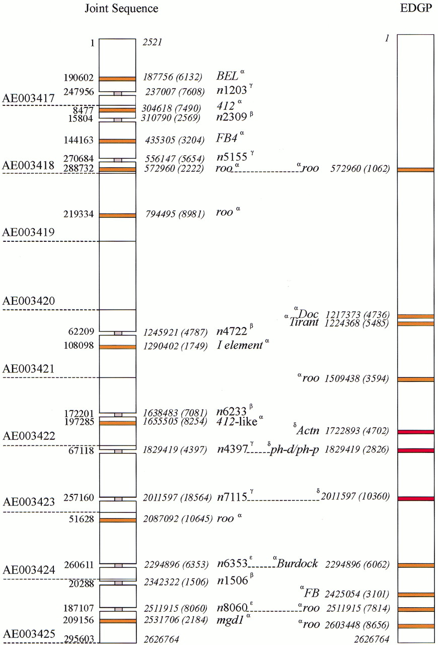 Sequence comparisons. A comparison of EDGP sequence of the tip of theX chromosome with that of the Drosophila Joint Sequence in the same region. The comparison was made using theMUMmer program (see Methods). The GenBank accession numbers corresponding to the Joint Sequence are shown on the left (AE003417–AE003425); note that this is part of a unitig (Myers et al. 2000). The blocks indicate regions of ⋝1 Kb present in one sequence but not the other. The position and length of each block of sequence ⋝1 Kb that is unique to one sequence is shown; each GenBank accession is numbered to the left of the unitig, the corresponding base position within the EDGP sequence is shown in italics to theright of the unitig. The EDGP sequence is numbered continuously. The length of each block of unique sequence is in parentheses. The nature of these sequence segments is shown in thecenter (note that a segment may include sequences in addition to those identified here). The segments corresponding to transposable elements are indicated in orange; those corresponding to known genes are red; a gray “neck” depicts a sequence interrupted by a large block of n's of length N (nN). The Greek superscripts (α,β,γ,ɛ,δ) refer to the class of sequence difference (see text). Note that there are an additional nine transposable elements in the EDGP sequence that are not seen to differ in the Joint Sequence.