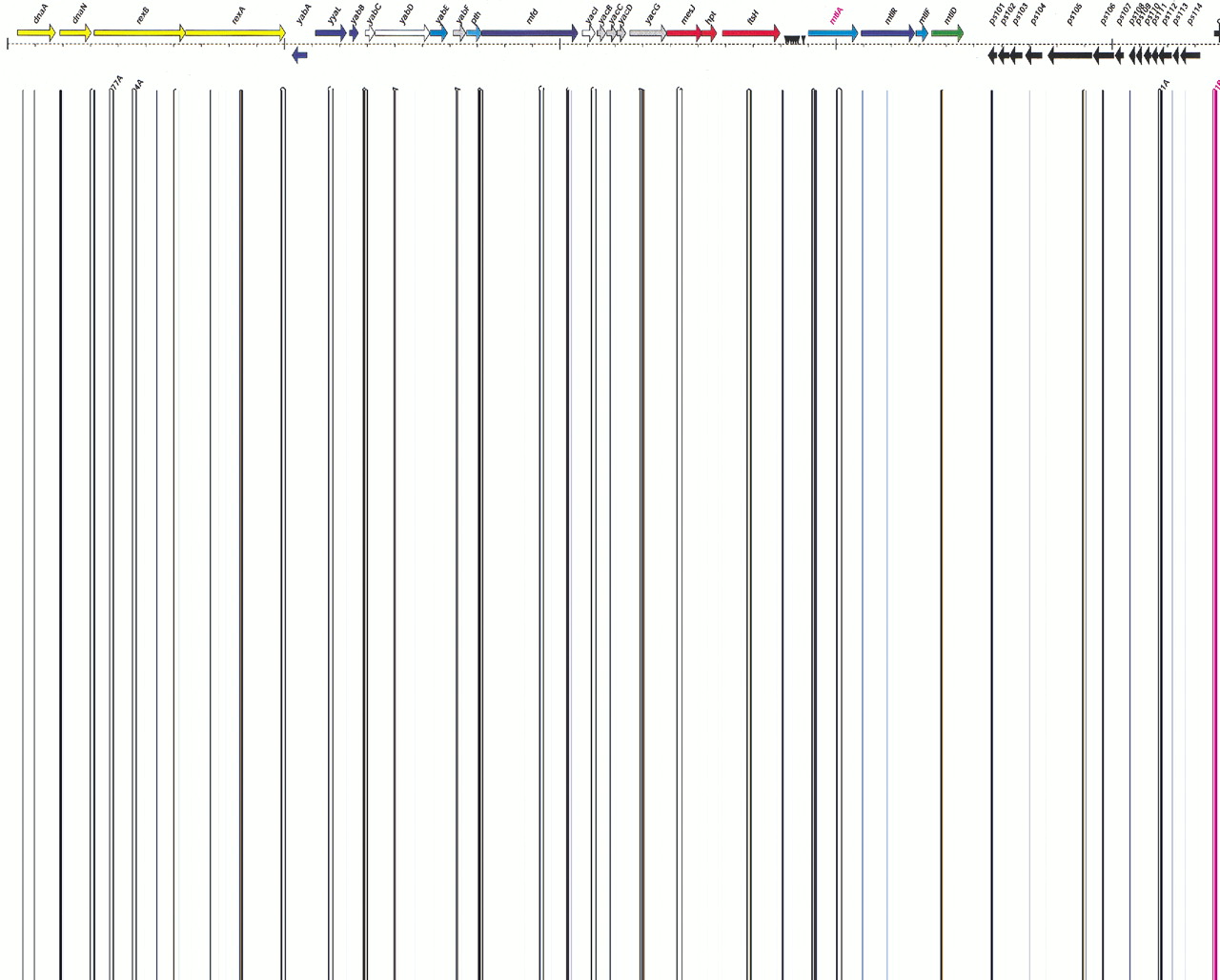 Linear map of the Lactococcus lactis ssp. lactisIL1403 chromosome. Coding regions are shown as arrows color-coded to the assigned functional categories. IS-elements and rRNA genes are shown as black arrows with white designation numbers inside. Symbols shown in pink identify genes in which frameshifts were detected.