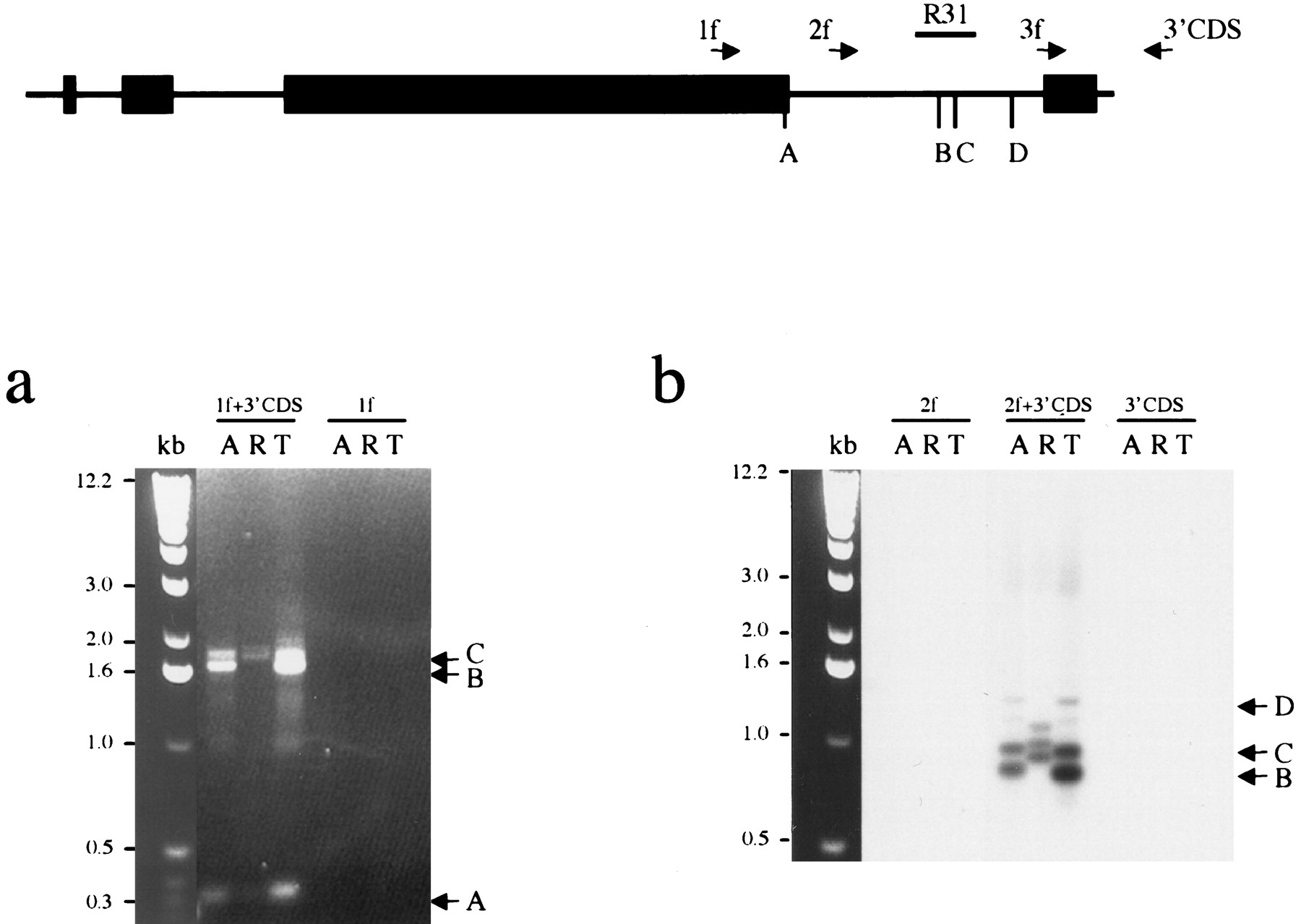 Mapping the vole Xist 3′ end. The schematic represents theXist exons 5–8. The location of primers used for 3′ RACE is indicated with arrows. The positions of major polyadenylated 3′ ends ofXist transcripts (A, B, C, D) and probe R31 used for hybridization are shown. (a) 3′ RACE amplification of M. arvalis (A) and M. kirgisorum (T) total RNA, and M. rossiaemeridionalis (R) poly A+ RNA with combination of gene-specific and universal primers, 1f +3′CDS, 2f +3′CDS, 3f +3′CDS. 1f, 2f and 3′CDS primers only were used as negative control to assure specificity of amplification. Ethidium bromide stained gel is shown for primer pair 1f +3′CDS and 1f control. Three major bands (A, B, C) are indicated with arrows. (b) Southern blot hybridization of Xist probe R31 is shown for primer pair 2f +3′CDS and controls to prove specificity of amplified fragments. Bands corresponding to the 3′ ends of Xist (B, C, D) are indicated with arrows.