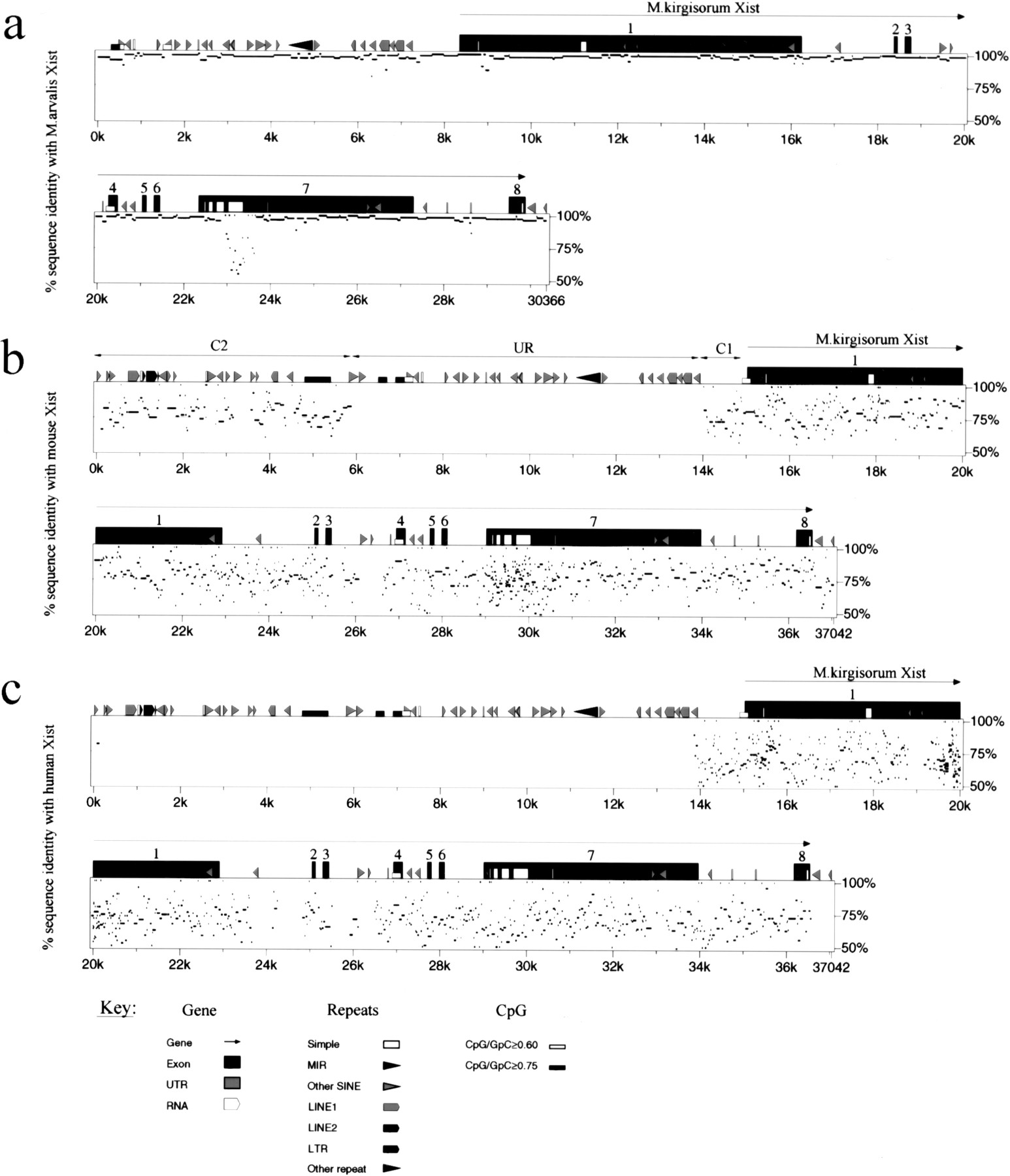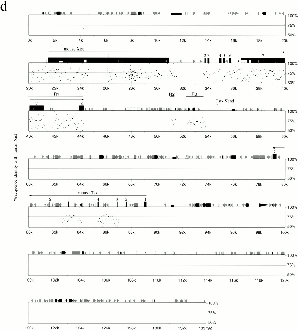 Comparative analysis of Xist gene in vole, mouse and human. (a) Percent identity plot (PIP) of M. kirgisorum Xistrelative to M. arvalis Xist. M. kirgisorum genomic sequence is shown on the X axis, and the percentage of its identity (50%–100%) to M. arvalis Xist is shown on theY axis. Black boxes illustrate Xist exons; the other sequence features and repeat elements are indicated with shape and shade coded icons (see annotation underneath Figure, panel c). (b) PIP of M. kirgisorum Xist (X axis) relative to mouse Xist (Y axis). (c) PIP ofM. kirgisorum Xist (X axis) relative to humanXist (Y axis). (d) PIP of mouseXist (X axis) relative to human Xist(Y axis); regions 1, 2, and 3 (Lee et al. 1999) are marked as R1, R2, and R3, respectively. (e) PIP of human Xist(X axis) relative to mouse Xist (Y axis); regions 1, 2, and 3 (Lee et al. 1999) are marked as R1, R2, and R3, respectively. (f) Comparison of SINE, LINE, LTR elements and total interspersed repeat representation in the Xist upstream sequence of M. arvalis (A), M. rossiaemeridionalis(R), M. transcaspicus (T), M. kirgisorum (K), M. musculus (M), and H. sapiens (H). The Y axis represents the percentage of genomic Xist upstream sequence occupied by repeat elements. (Figure continues on following page.)