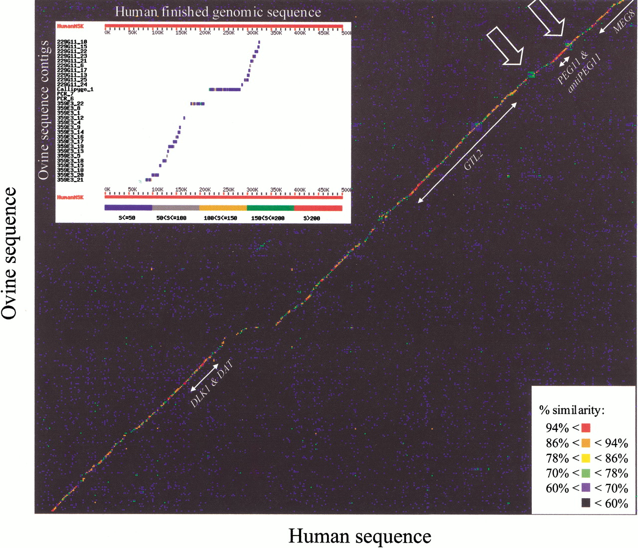 Dot-matrix comparison of the human and ovine genomic sequences. The percent similarity represented by a given dot is indicated according to the color code shown. Positions and names of the identified genes are shown. Simple sequence repeats flanking the PEG11 gene are marked by arrows. (Inset) Alignment and ordering of 30 of the 55 ovine sequence contigs against the orthologous human genomic sequence by use of BLAST (Altschul et al. 1990). The ovine contigs are shown sorted according to their relative positions predicted on the basis of the observed human–ovine homology. Ovine contigs showing no hits with the human sequence in this figure were positioned on the basis of BLAST searches performed at lower stringency (data not shown).