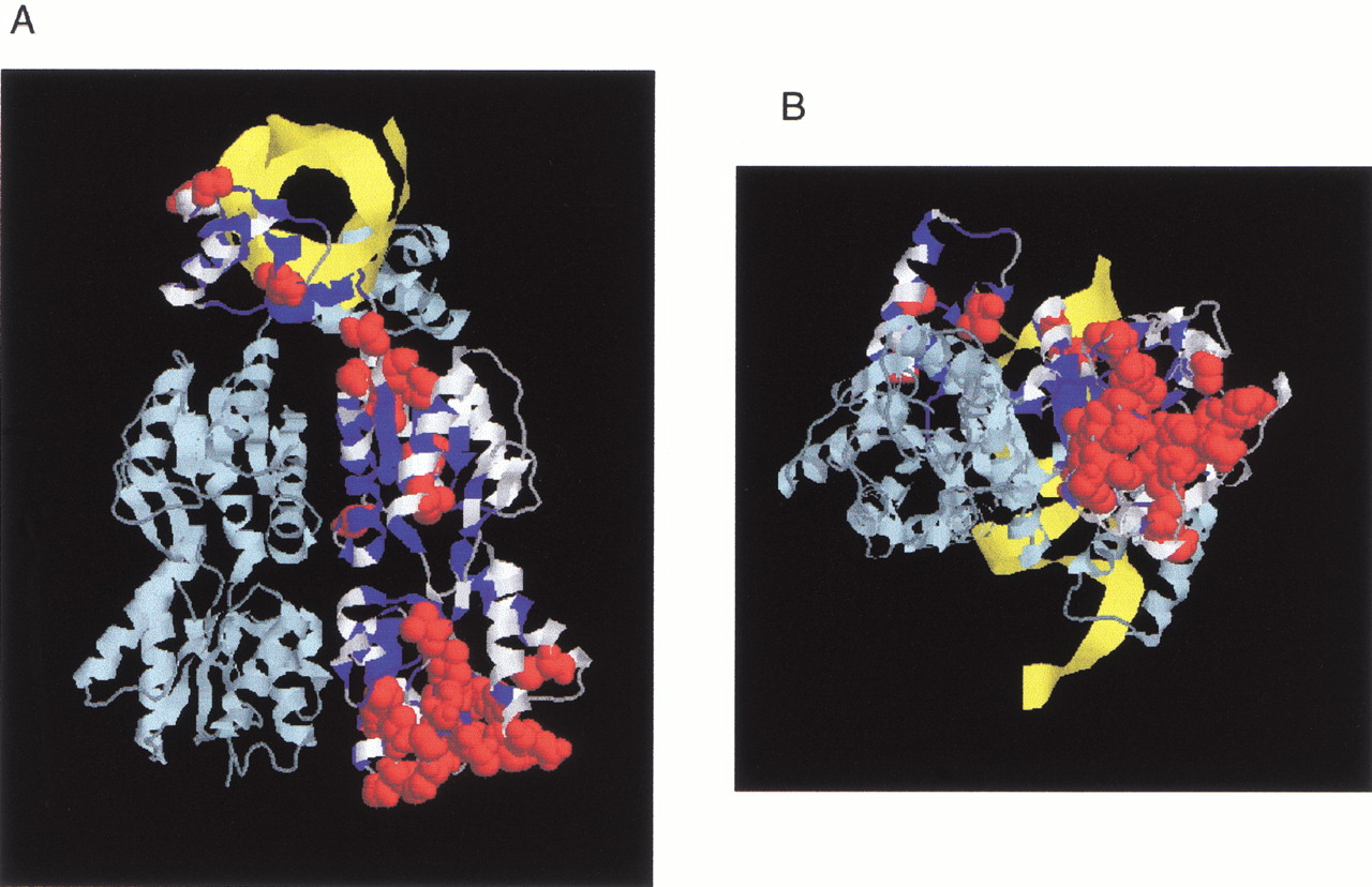 (A) Structure of LacI as a homodimer (light and dark blue strands) with DNA (yellow strand). The N-terminal subdomain whose interface is important for DNA binding and the allosteric mechanism is at the upper part of the figure; the C-terminal domain is at the bottom. The 186 positions tolerant for six or more substitutions are colored in white on one monomer (Markiewicz et al. 1994; Suckow et al. 1996). For 31 of these positions, >50% of the substitutions were predicted to affect phenotype according to SIFT when experimentally they did not (see also Fig. 2, asterisks). These positions are shown as space-fill atoms in red. Noticeably, many of these occurred at the bottom face of the C-terminal domain. This structure is 1EFA from PDB (Bell and Lewis 2000). (B) Same figure rotated 90° about the Z-axis.