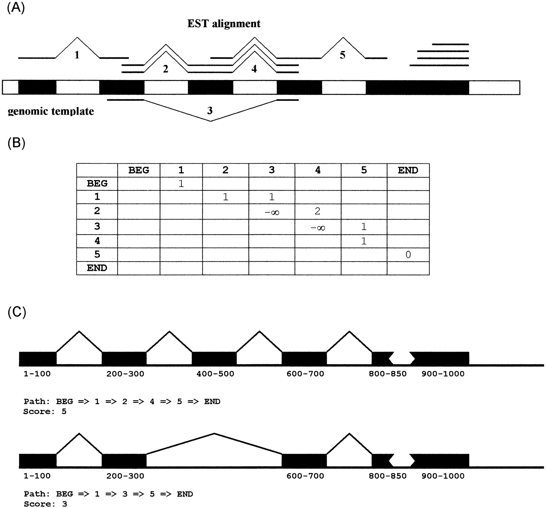 Gene structure assembly. (A) Shown here is a hypothetical gene structure (block) and genomic EST alignments (line). There are five inferred splice pairs. Splice pairs 1 and 2 are transitively connected. Splice pairs 2 and 4 are contiguously connected. Both splice pairs 2 and 4 are mutually exclusive with splice pair 3. There is a coverage gap between splice pair 5 and the 3′ end. (B) The connectivity matrix for assembling this gene structure. The nodes include the 5′ beginning (BEG) of the EST alignments, the 3′ end (END) and five predicted splice pairs. The numerical value in cell M(i,j) is determined from the EST-encoded connectivity between the ithand jth nodes. For instance, two EST alignments link splice pairs 2 and 4, so M(2,4) = 2. (C) Two alternative gene structures inferred from two different traces through the matrix. The higher scoring trace gives rise to the predominant gene structure.