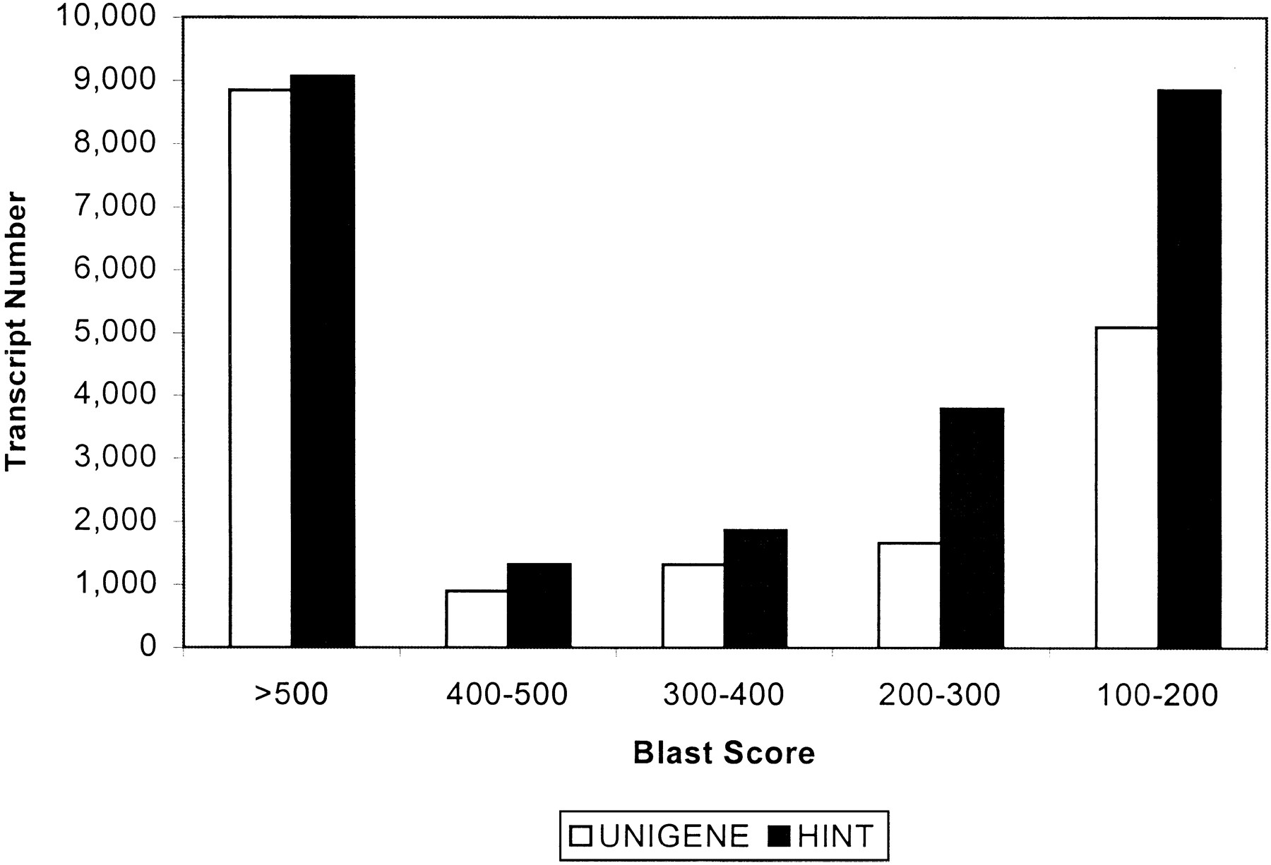 The assembly of human transcripts enabled a greater number of UNIGENE entries with a protein homology. The UNIGENE and HINT consensus sequences were aligned to the SWISSPROT, TrEMBL, and PIR protein databases by use of the program BLASTX. Protein alignments with the highest scores were selected from each UNIGENE and HINT transcript consensus and broken into five groups according to their BLAST scores, ranging from the highest >500 to 100–200 (x-axis). (y-axis) Numbers of transcript consensus. (Open bars) UNIGENE transcripts; (closed bars) HINT consensus.
