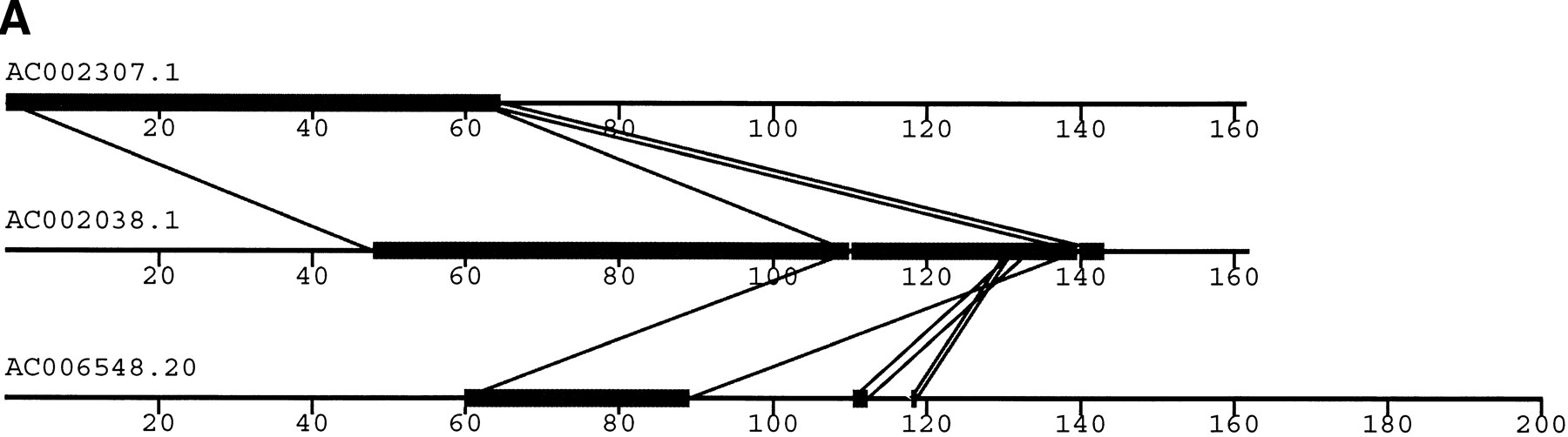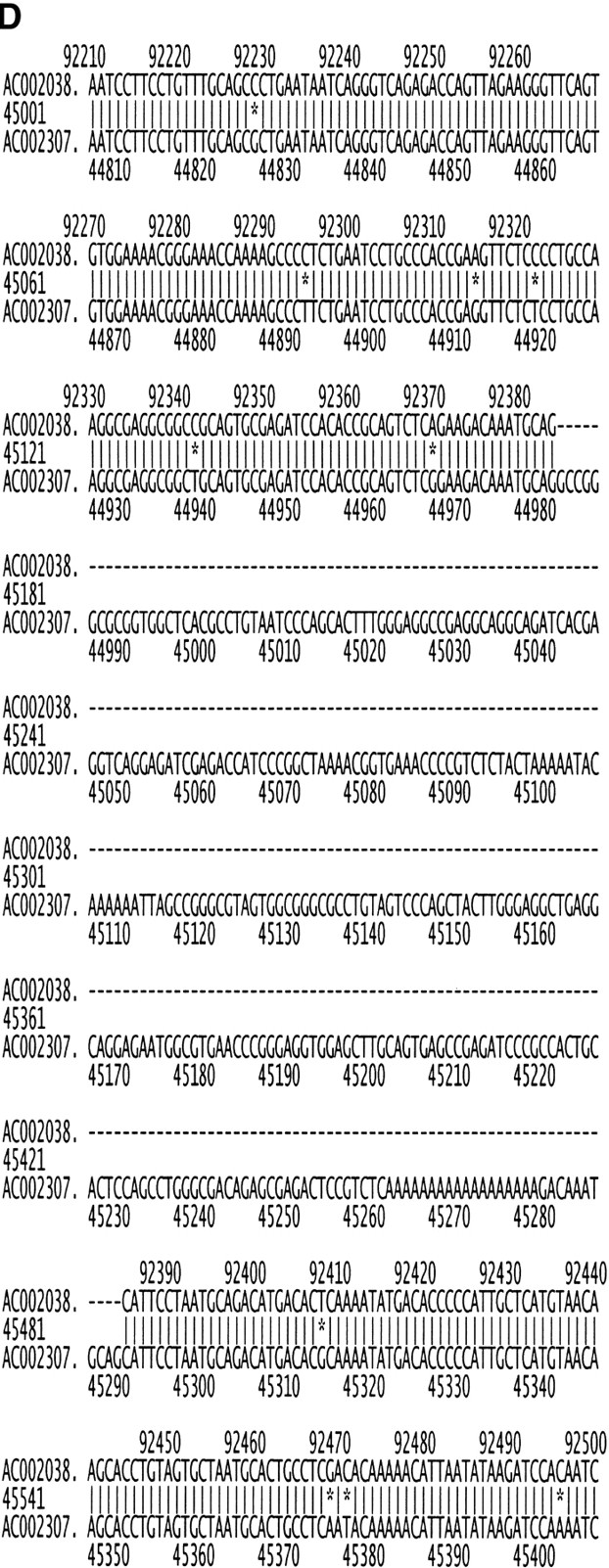 Example of pericentromeric duplication using fuguization method. (A) A graphical view of the output for our method as displayed in the program PARASIGHT (J.A. Bailey, unpubl.). Compared to miropeats (B; Parsons 1995), all of the positions of similarity have been captured as continuous large alignments (C). An example of a large insertion-deletion in an alignment (D) demonstrates the ability of fuguization to traverse such regions returning larger more meaningful alignments. Lower thresholds (>500 aligned bases; >90% identity) were used for this test case compared to our genome analysis.