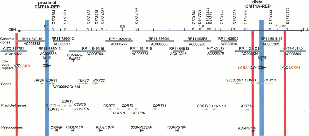The genomic sequence map of the CMT1A duplication/HNPP deletion region in 17p12. The top solid horizontal line represents the genomic sequence of the CMT1A/HNPP region in the centromere to telomere orientation. Position 0 is assigned to the first base of the proximal CMT1A–REP and vertical markings are placed every 100 kb for reference. The STR polymorphic genetic markers are shown above. Shaded horizontal boxes below depict the large insert clones used to derive genomic sequences. Clones are identified by their individual names and GenBank accession numbers. Proximal and distal CMT1A–REPs are shown as vertical blue boxes, and newly identified low copy repeats (LCRA1, LCRA2, LCRB) are represented as vertical red bars. Arrowheads indicate the orientation/direction of each repeat unit. Underneath are shown known genes (green), predicted genes (purple), and pseudogenes (black), with arrows pointing in the direction of transcription. (MITE and HSMAR2-PMP22) mariner transposon-like elements; (CYPAP) cyclophilin A pseudogene; (60SRPL9P) 60S ribosomal protein L9 pseudogene; (60SRPL23AP) 60S ribosomal protein L23A pseudogene; (40SRPS18P) 40S ribosomal protein S18 pseudogene.