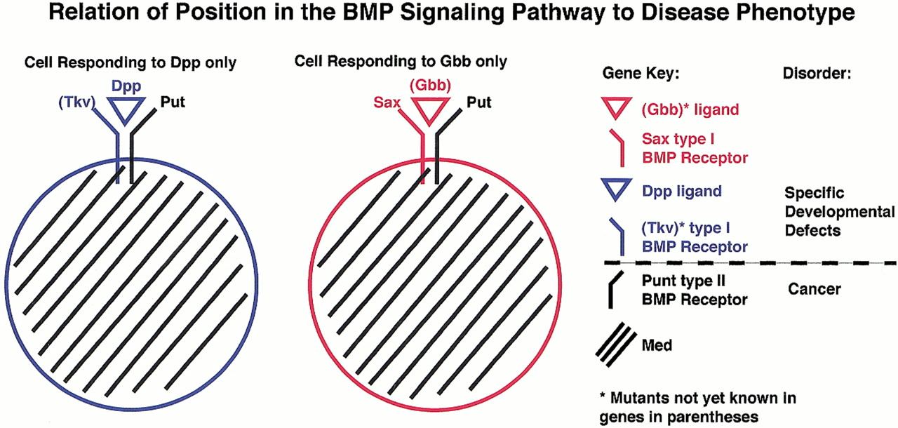 Relationship of a components position in the bone morphogenetic protein (BMP) pathway to human disease phenotypes. In general, there is a relationship between the position of a component in signaling pathway to the disease phenotype resulting from inactivation of that component. An example of this trend is the BMP pathway. Mutations in components acting at the start of the BMP signal transduction cascade such as a particular BMP ligand (e.g., Drosophila Dpp = Human BMP4/BMP2) or a specialized BMP type I receptor (DrosophilaSaxophone = type I receptor for the Screw and Glass Bottom Boat ligands) result in specific developmental defects (e.g., brachydactyly). Mutations acting on subsequent steps in the BMP pathway, which mediate the effects of several converging upstream inputs such as the universal type II BMP receptor (e.g.,Drosophila Punt = type II receptor mediating all BMP signaling) or the cytoplasmic/nuclear SMAD transducer (e.g.,Drosophila Medea = Human SMAD4) result in generalized misregulation of cellular growth control and cancer (e.g., colorectal or pancreatic cancer).