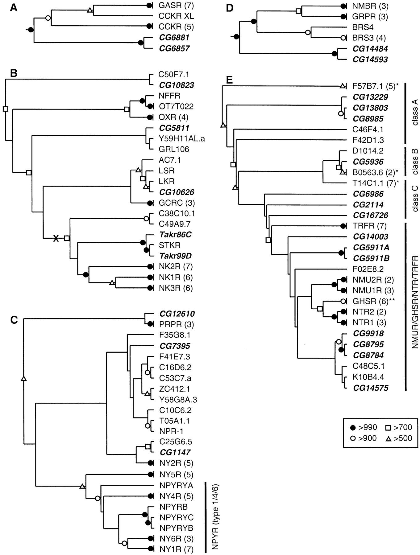 Neighbor-joining phylogenetic trees for the Family A, Group III-B receptors. For Family and Group classifications, see Kolakowski (1994) (see http://www.gcrdb.uthscsa.edu/). (A) Rooted tree for the gastrin/cholecystokinin (CCK) receptors. (B) Unrooted tree for the neurokinin receptors (NKRs) and related GPCRs. The midpoint of the tree is indicated with an “X.” (C)Unrooted tree for the neuropeptide Y (NPY) receptors (NPYRs) and prolactin releasing receptors (PRPRs). (D) Rooted tree for the bombesin/gastrin releasing peptide receptors. (E) Unrooted tree for the neuromedin U receptors (NMURs), growth hormone secretagogue receptors (GHSRs), neurotensin receptors (NTRs), thyrotropin releasing hormone receptors (TRFRs), and a large family of related orphan receptors from Caenorhabditis elegans. The C. elegans orphan receptors included here belong to one of three clades (classes A–C). (*) Omitted receptors are additional C. elegansorphan GPCRs; (**) omitted receptors are additional GHSRs and closely related orphan GPCRs. In A and D, a monophyletic set of 26 biogenic amine receptors (not shown) was used as the outgroup to determine the root of the trees (see Methods). In C andE, the location of the tree midpoint was ambiguous and is therefore not indicated. Portions of the trees representing groups of closely related receptors were omitted (the number of related receptors on each branch is indicated in parentheses). Drosophila GPCRs are listed in bold and italics. (BRS3) Bombesin receptor subtype 3; (BRS4) bombesin receptor subtype 4; (CCKR) CCK receptor type A; (CCKR XL) Xenopus laevis CCKR; (GASR) gastrin/CCK receptor type B; (GCRC) glucocorticoid-induced receptor; (GRL106) Lymnaea stagnalis cardioexcitatory receptor; (GRPR) gastrin releasing peptide (GRP) receptor; (LKR) Boophilus microplus (tick) leucokinin-like peptide receptor; (LSR) L. stagnalislymnokinin receptor; (NFFR) neuropeptide FF/neuropeptide AF receptor; (NK1R–NK3R) NKR types 1–3; (NMU1R and NMU2R) neuromedin U receptor types 1 and 2; (NPR-1) product of the C. elegans npr-1 gene; (NPYRYA–NPYRYC) orphan zebrafish NPYRs; (NPYRB) Gadus morhua(Atlantic cod) NPYR; (NTR1 and NTR2) neurotensin receptor types 1 and 2; (NY1R–NY6R) NPY receptor types 1–6; (OT7T022) putative mammalian RFRP receptor; (OXR) orexin/hypocretin receptor; (STKR) Stomoxys calcitrans (stable fly) tachykinin receptor. The remaining non-Drosophila sequences are orphan GPCRs from C. elegans. Symbols denote bootstrap support, out of 1000 replicates, that was >500: (filled circles) >990; (open circles) >900; (open squares) >700; (open triangles) >500.
