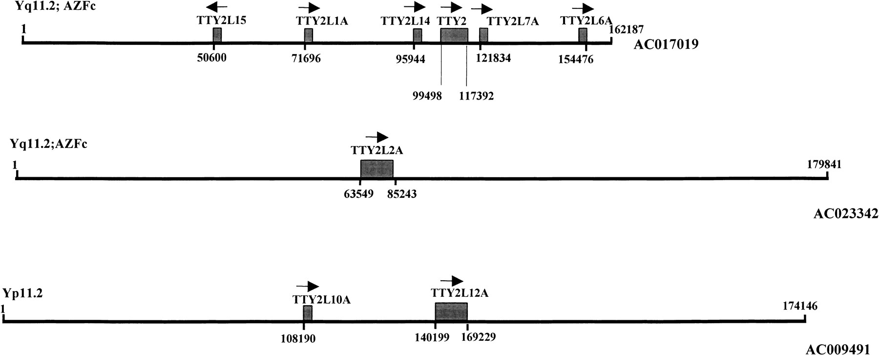 Localization of the TTY2 gene and other members of this gene family on three genomic fragments (AC017019, AC023342, and AC009491); arrows indicate the relative orientation of the genes; numbers below arrows indicate the first bp of identity with the