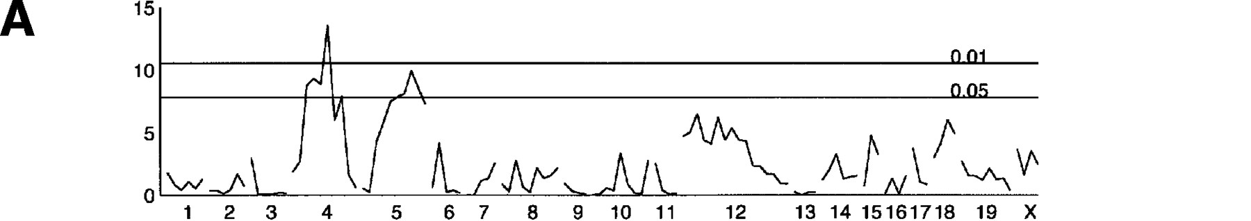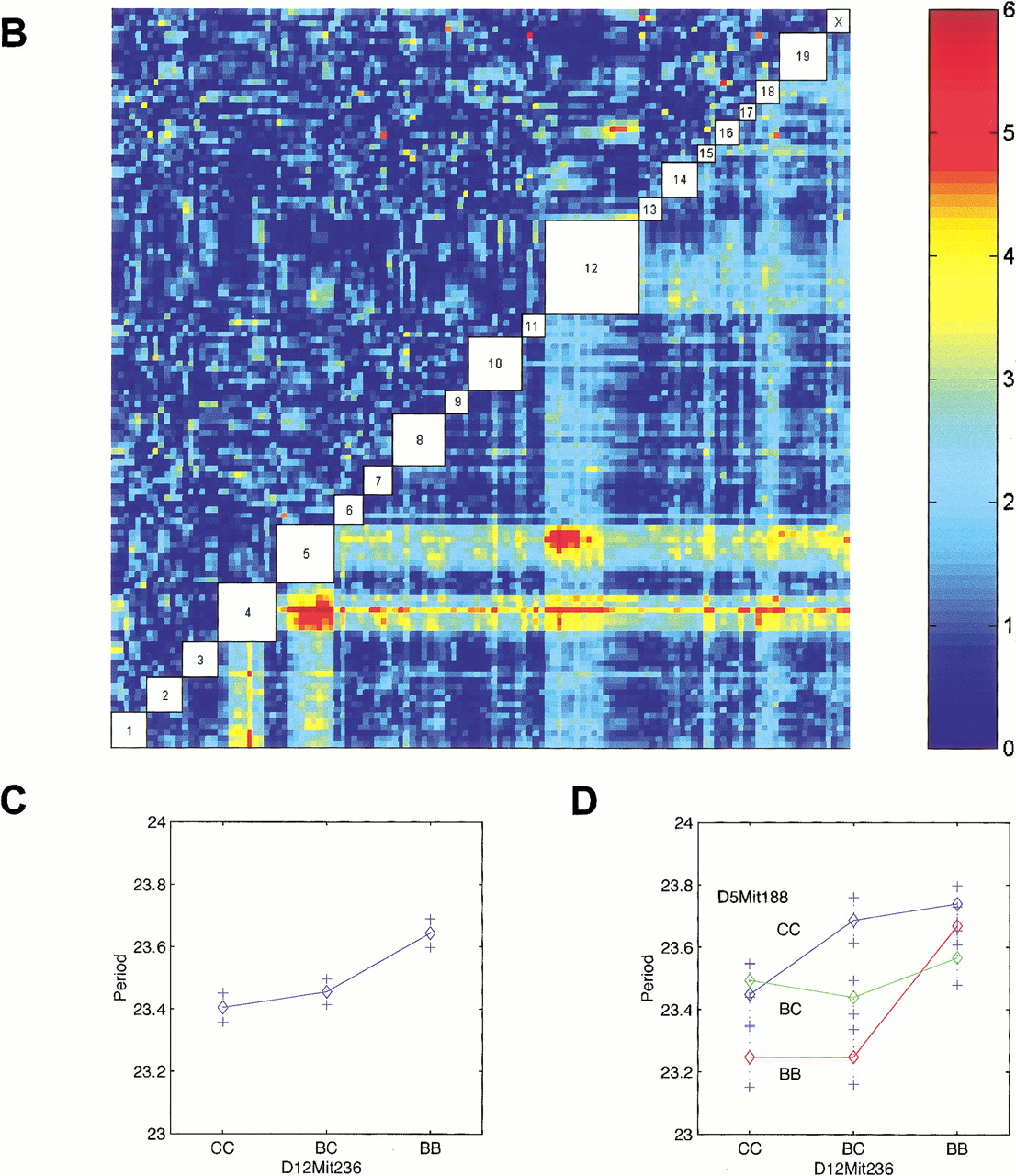 Genome-wide scan for free-running period phenotype. (A) Single marker regression genome scan for free-running period. Thevertical axis is the regression F-statistic (with 2 and n-3 degrees of freedom). Threshold values estimated from 1000 permutations of the trait data are indicated as horizontal lines at genome-wide significance levels of 0.05 and 0.01. The horizontal axis is indexed by the marker loci. Locations of markers are indicated but the relative spacing of the markers is not conserved in the graph. (B) Pairwise marker regression genome scans. The results of the pairwise search for loci associated with free-running period is shown. The x and y axes of the figure are genetic markers arranged in order along the length of the 20 mouse chromosomes. Joint analysis of markers on the same chromosome was not carried out because of numerical problems. Chromosomal locations of the markers are indicated in the empty boxes along the main diagonal of the figure. The color scale indicates the −log10 of the nominalP-value of the F-statistics. The primary scan F-statistic (with 8 and n-9 degree of freedom) is shown below the main diagonal and the secondary F-statistic for interaction (with 4 and n-9 d.f.) is shown above the diagonal. Significant locus pairs identified by the genome scans are listed in Table 3. (C) Main effect ofFrp-3 on free-running period. X-axis represents genotypes at Frp-3 locus. C represents BALB/cJ and B represents C57BL/6J allele. BC represents heterozygote at this locus.Y-axis is free-running period. (D) Pairwise interaction of Frp-2 and Frp-3 on free-running period. X-axis is for genotypes at Frp-2 locus.Y-axis is free-running period. Blue line is CC, green line for BC, and red line for BB at Frp-2 locus.