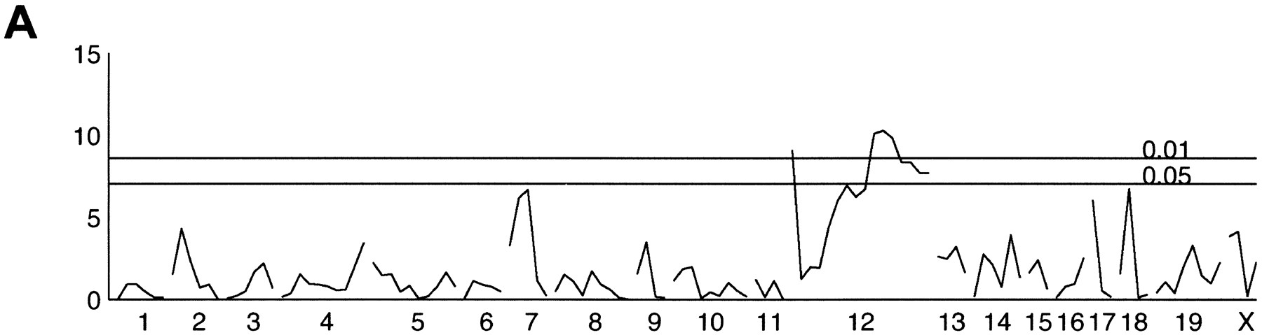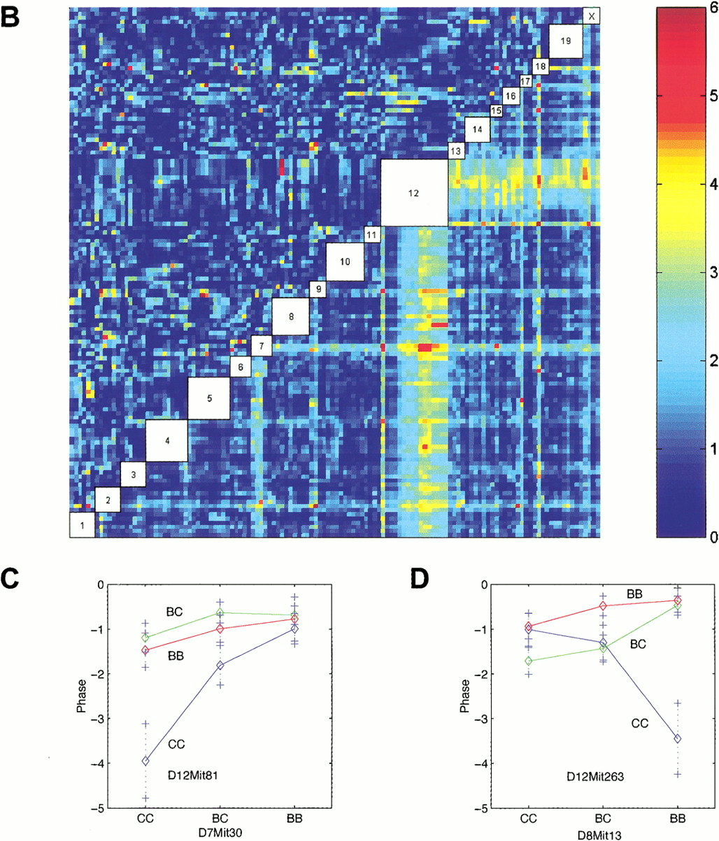 Genome-wide scan for phase angle of entrainment phenotype. (See Fig. 4for plotting details.) (A) Single marker regression genome scans for phase angle of entrainment. (B) Pairwise marker regression genome scans. (C) Pairwise interaction ofAngle-1 and Angle-4. (D) Pairwise interaction of Angle-2 and Angle-5.