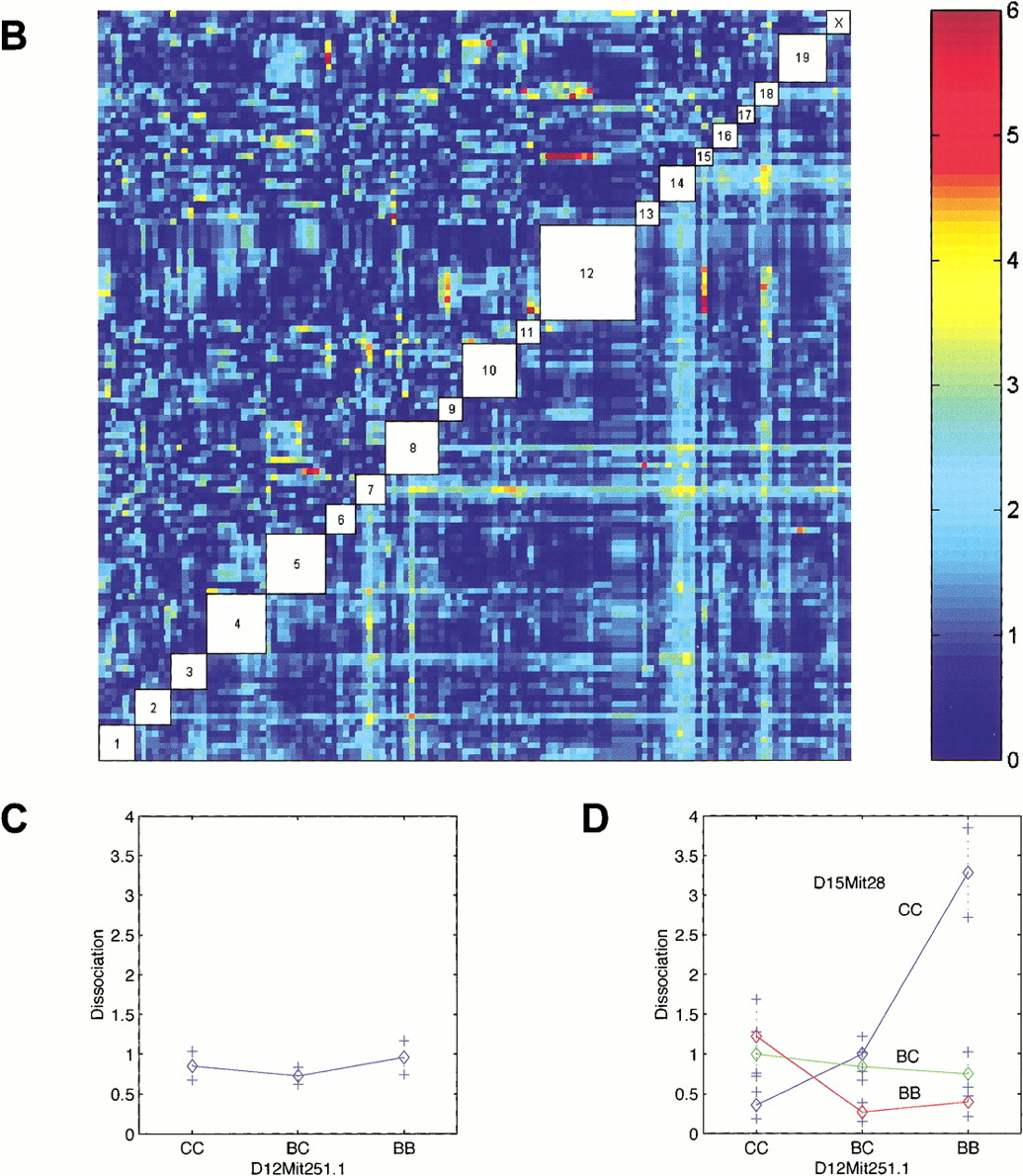 Genome-wide scan for dissociation phenotype. (See Fig. 4 for plotting details.) (A) Single marker regression genome scans for dissociation. (B) Pairwise marker regression genome scans. (C) Main effect of Disso-1. (D) Pairwise interaction of Disso-1 and Disso-2.