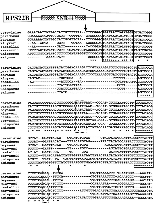 A CLUSTALW alignment of SNR44 sequences encoding an H/ACA box snoRNA. The positions of the start and end of S. cerevisiae SNR44 are marked with arrows. Highly conserved sequences are boxed. The H and ACA boxes are enclosed in dashed lines. The plus symbols in the consensus line indicates that seven of eight nucleotides in the alignment are conserved and were added to highlight conservation of sequence upstream of the H box. The structure of theRPS22B transcript including the intronic SNR44 gene is shown above the sequence alignment.