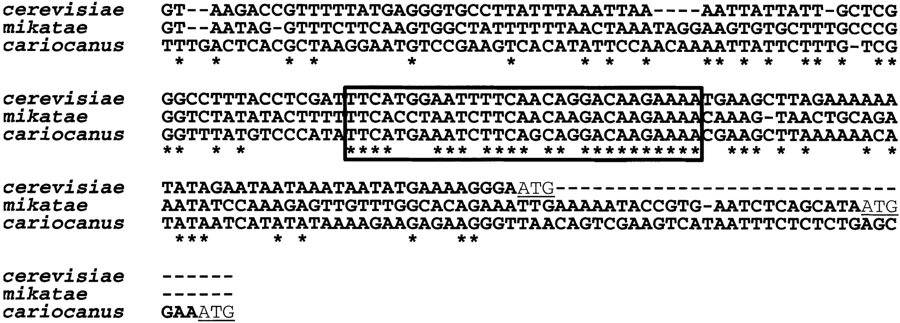 A CLUSTALW alignment of SEC35 promoter sequences of sensu stricto species reveals conserved elements that could function as regulatory elements. The conserved sequences are boxed; the S. cerevisiae ATG start codon and putative start codons for the other species are underlined.