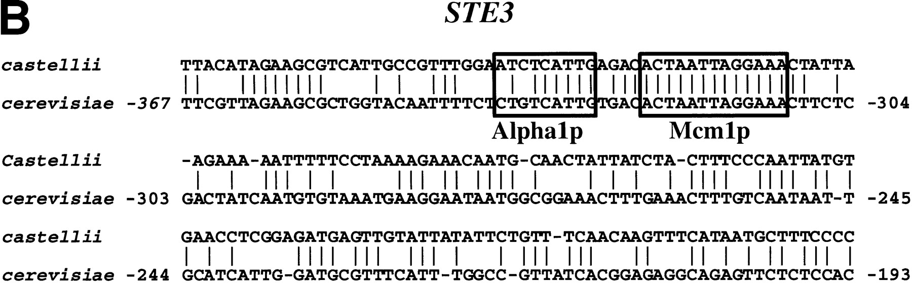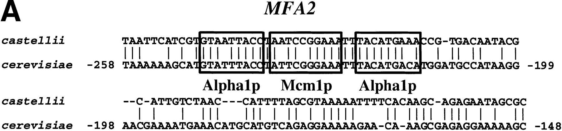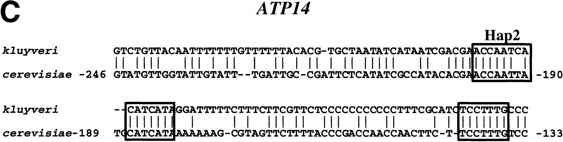 Known functional elements are conserved in BLASTNalignments between S. cerevisiae promoters and orthologous sequences of sensu lato species. (A) An alignment ofMFA2 promoter sequences from S. castellii and S. cerevisiae with known binding sites for Alpha1 and Mcm1 boxed. (B) An alignment of STE3 promoter sequences fromS. castellii and S. cerevisiae with known binding sites for Alpha1 and Mcm1 boxed. (C) An alignment of theATP14 promoter sequences from S. kluyveri and S. cerevisiae showing three conserved runs of sequence, one of which includes a consensus Hap2 (ACCAATNA) binding site. Numbers refer to the position of the S. cerevisiae sequence relative to the ATG start codon.