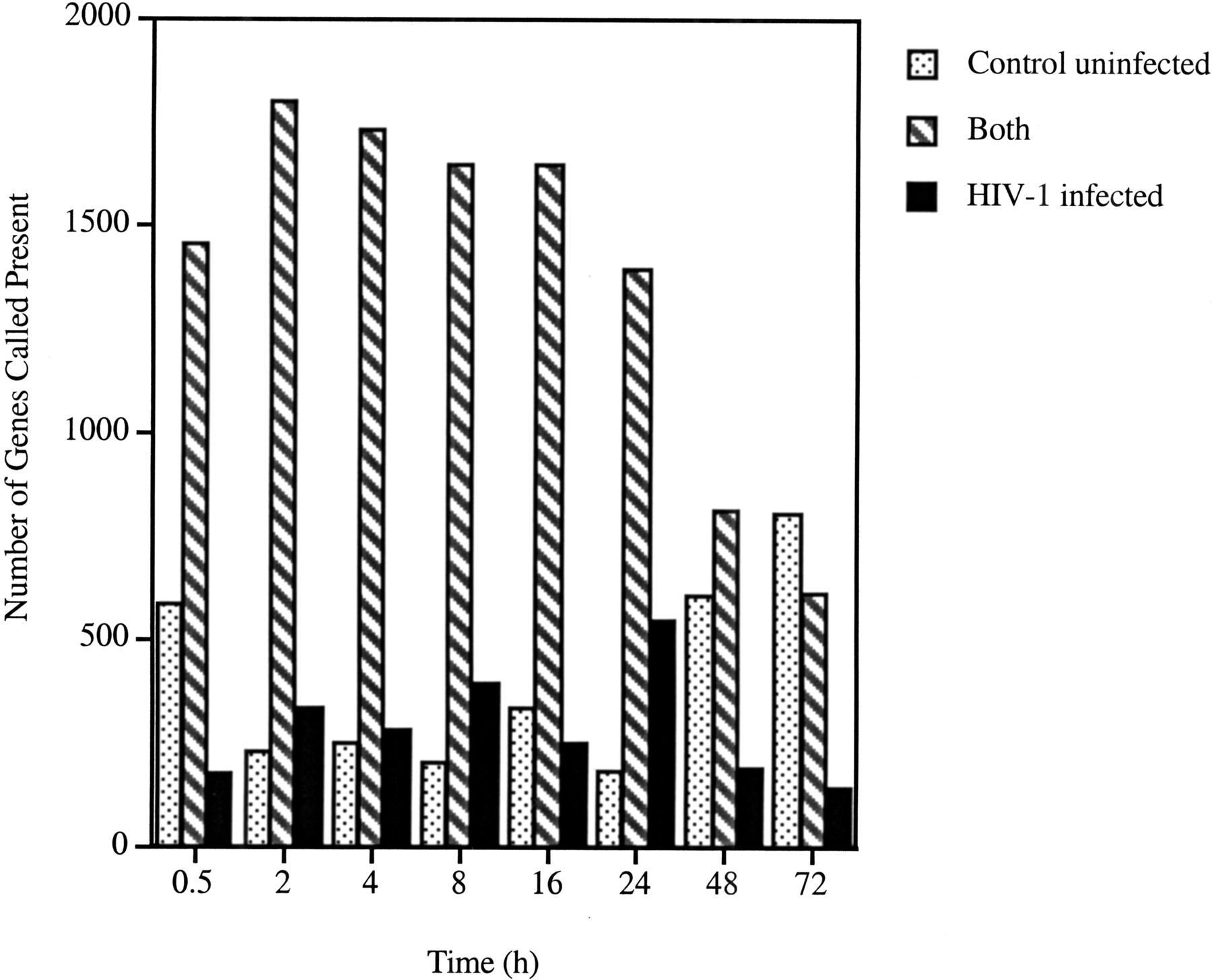 Genes expressed in control uninfected and HIV-1-infected cells. Stringent criteria were used for calling a gene present (i.e., a gene that can be reliably detected and quantitated with accuracy). A general down-regulation, especially with the HIV-infected population, can be noted. Genes that are expressed in control only increase from 184 at 24 h to 805 at 72 h, while genes specific for HIV-infected cells number 549 at 24 h and 148 at 72 h. Genes expressed in both populations diminish over time as more genes are shut down in the HIV-infected cell population.