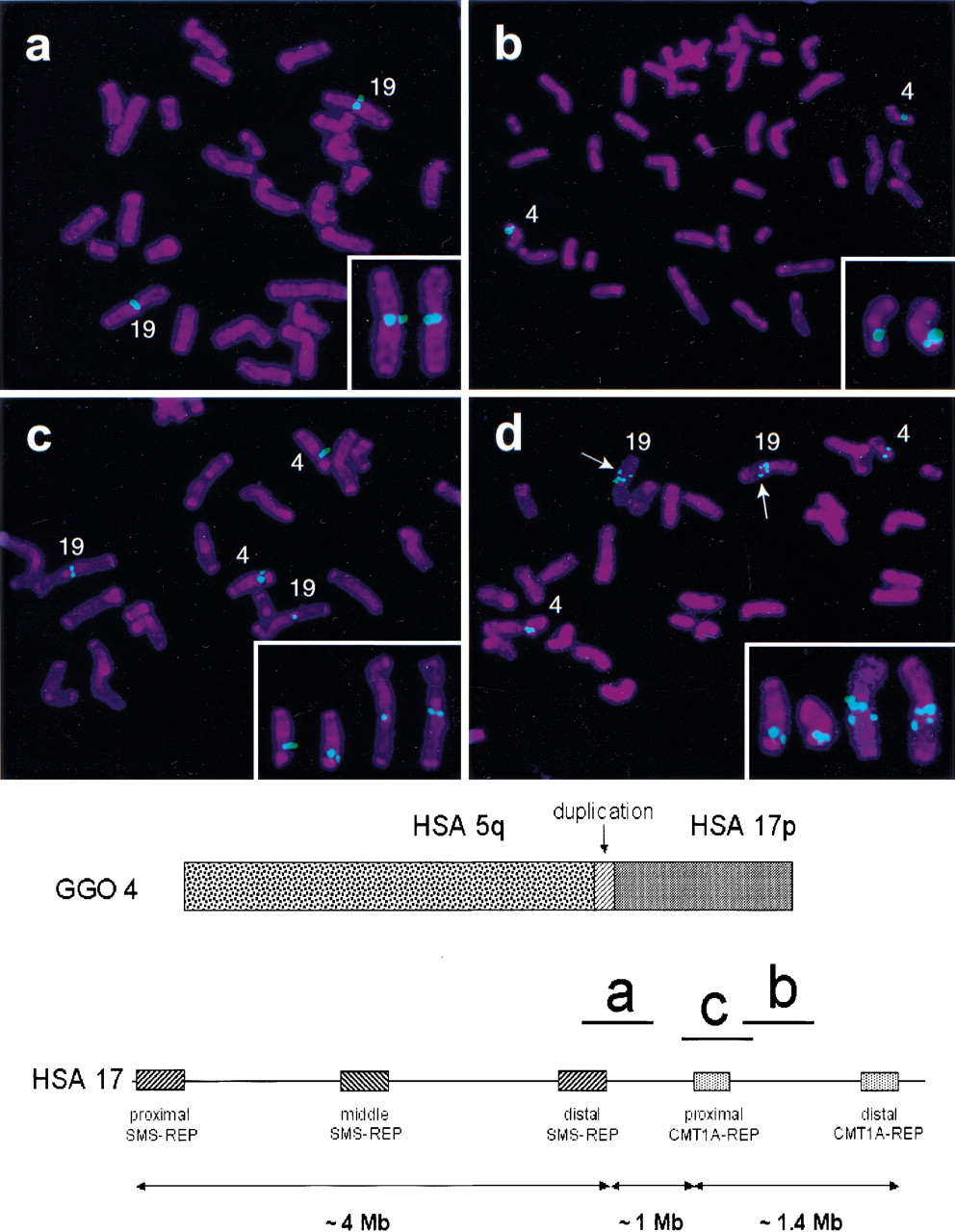 Gorilla metaphase chromosomes after hybridization with human BAC clones. Below is shown gorilla chromosome 4 (GGO 4), syntenic to human chromosomes 5 and 17. The vertical arrow indicates the ∼250 kb genomic duplication, originating from the GGO 19 segment, syntenic to human chromosome, (HSA) 17p12. Smith-Magenis syndrome low-copy repeats, SMS-REPs, and Charcot-Marie-Tooth disease type 1A low copy repeats, CMT1A-REPs, in the human chromosome 17p11.2p12 region are shown (telomere to right of figure) with the relative physical position of three BAC clones used in the FISH analysis that is shownabove. (a) CTD-3157E16 (HSA 17p12), located proximal to the translocation breakpoint. (b) RP11–726O12 (HSA 17p12), located distal to the translocation breakpoint. (c) RP11-385D13 (HSA 17p12, proximal CMT1A-REP), spans the translocation breakpoint and includes the genomic duplication in gorilla. (d) CTC-428H11 (HSA 5q13.3) spans the breakpoint. Arrows within the FISH picture indicate an additional hybridization signal, which is also located on the long arm of GGO 19. This apparent duplication is located distal to the evolutionary breakpoint identified in this study. Small panels in the lower right corners demonstrate only the gorilla chromosomes 4 and 19 with positive probe hybridization signals.