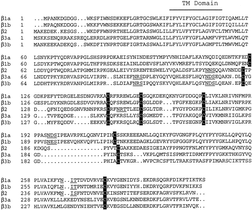 Comparison of zebrafish β subunits were aligned usingCLUSTALW. Ellipses in sequences allow optimal alignment for amino acid insertions/deletions. Conserved cysteines are shaded; potential amino-linked glycosylation sites are underlined. The single transmembrane (TM) domain is indicated by the solid lineabove the sequence. Amino acids are numbered to theleft of each line.