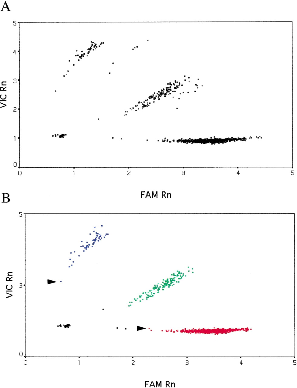 Genotyping results for the E298D SNP in the endothelial nitric oxide synthase gene. Data for 1699 genotypes are shown. (A) Raw data from the TaqMan PCR. (B) Data corrected for variation in pre-PCR fluorescence and k-means clustering. Fluorescence for the E allele is plotted along the X-axis (the dye is “FAM”) and for the D allele, labeled with the fluor “VIC”, along the Y-axis. “Rn” is fluorescence from the reporter dye divided by that from the passive reference dye. (Red squares) Samples homozygous for the E allele; (blue squares) samples homozygous for the D allele; (green squares) E/D heterozygotes; (black squares) “no DNA” controls or samples that failed to amplify. Arrows indicate samples with a very low conditional probability of belonging to that particular cluster.
