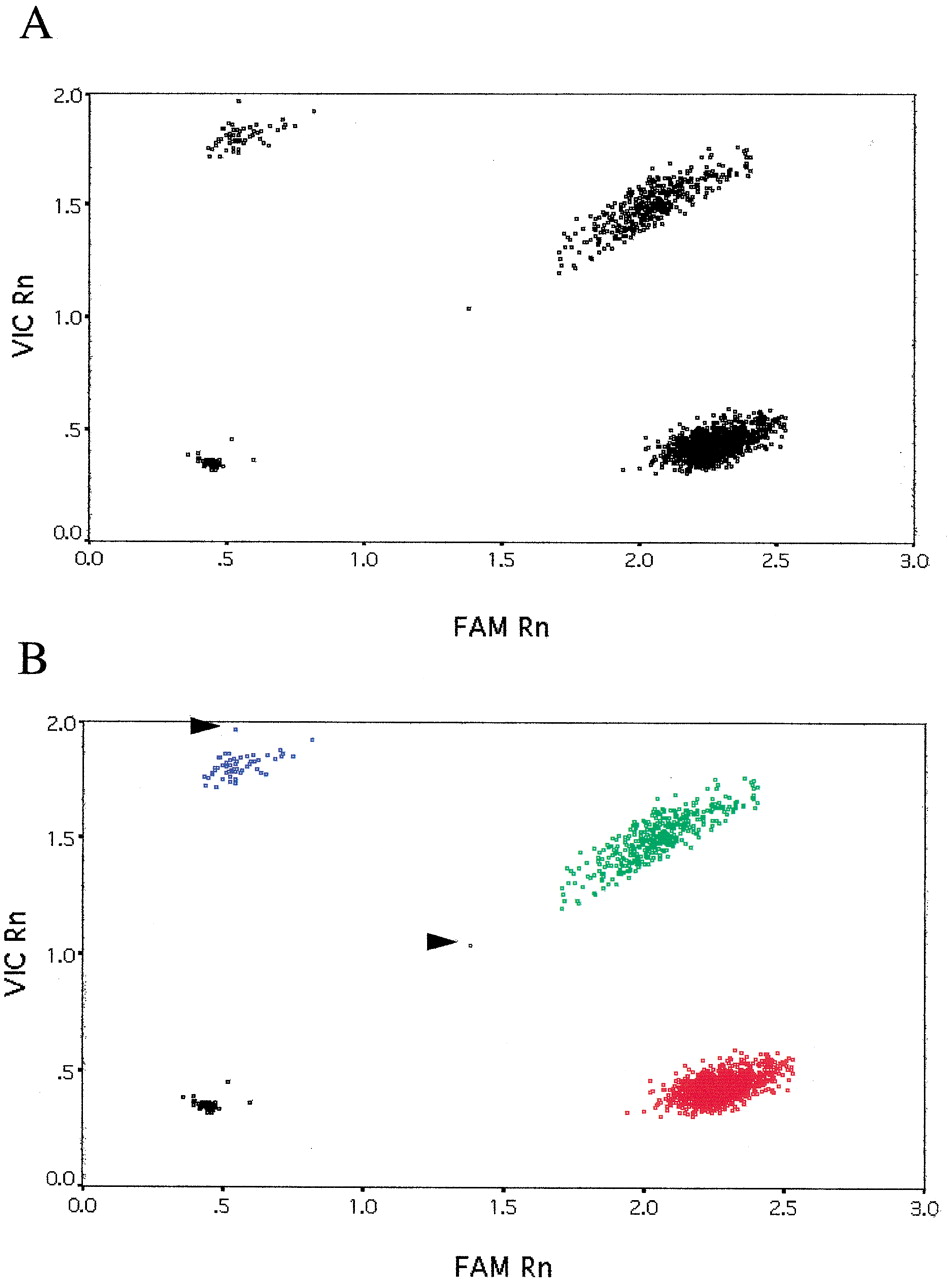 Genotyping results for the CYP11B15 SNP. Data for 1699 genotypes are shown. (A) Raw data from the TaqMan PCR. (B) Output of the k-means clustering. Fluorescence values for the C and G alleles are plotted along the X andY axes, respectively. (Red squares) C/C homozygotes; (green squares) G/C heterozygotes; (blue squares) G/G homozygotes; (black squares) “no DNA” controls or failed PCRs. Arrows indicate samples with a very low conditional probability of belonging to that particular cluster.