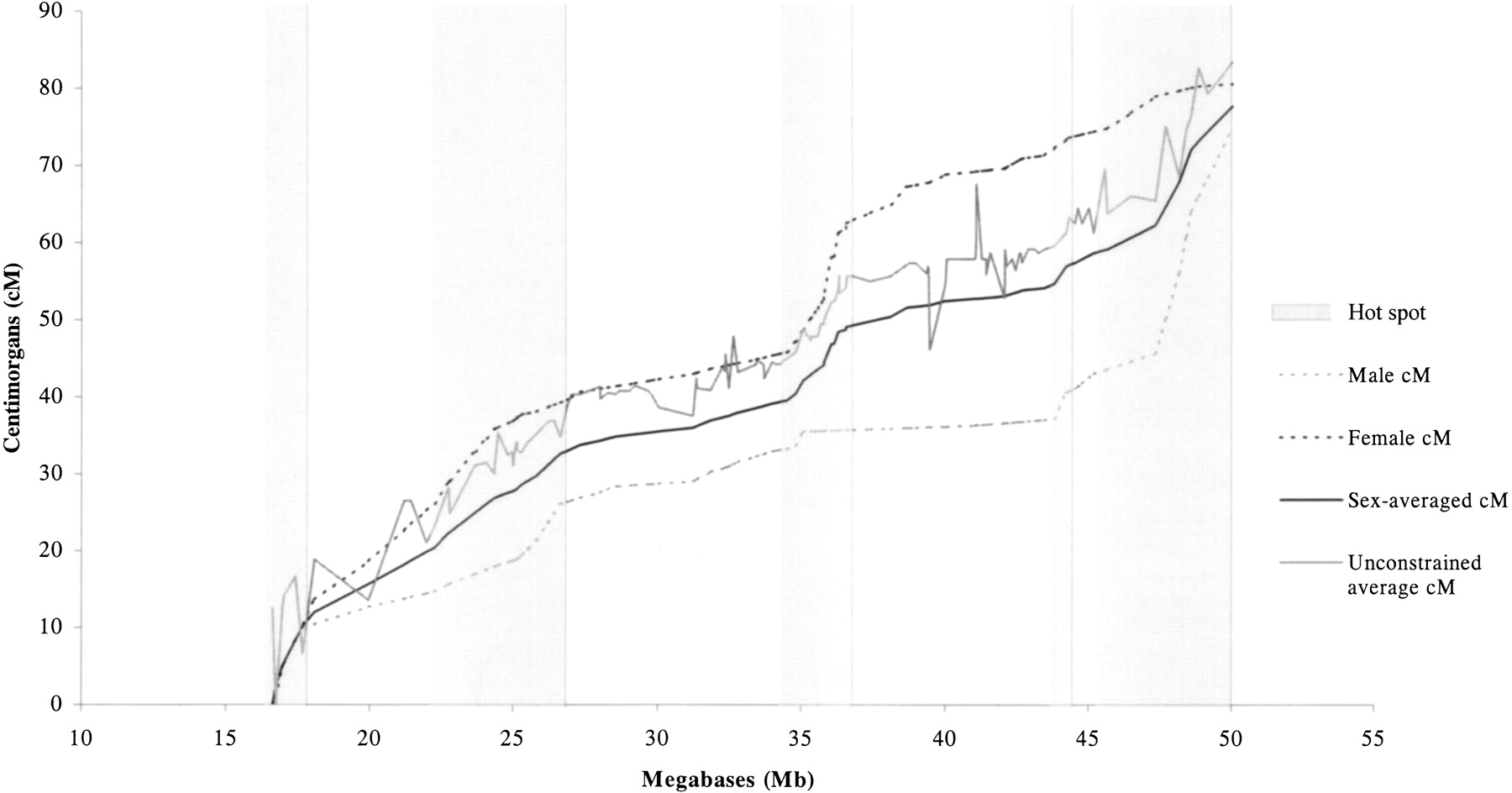The relationship between recombination and the sequence-based physical map. Recombination hot spots in either sex are shaded.