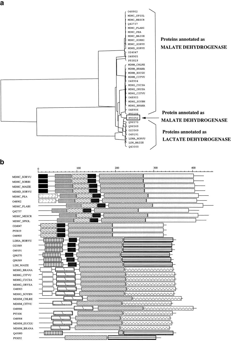 P93052 makes the link between the two subsets. (b) The domain decomposition of the proteins also classifiesP93052 (bottom) as a lactate dehydrogenase.