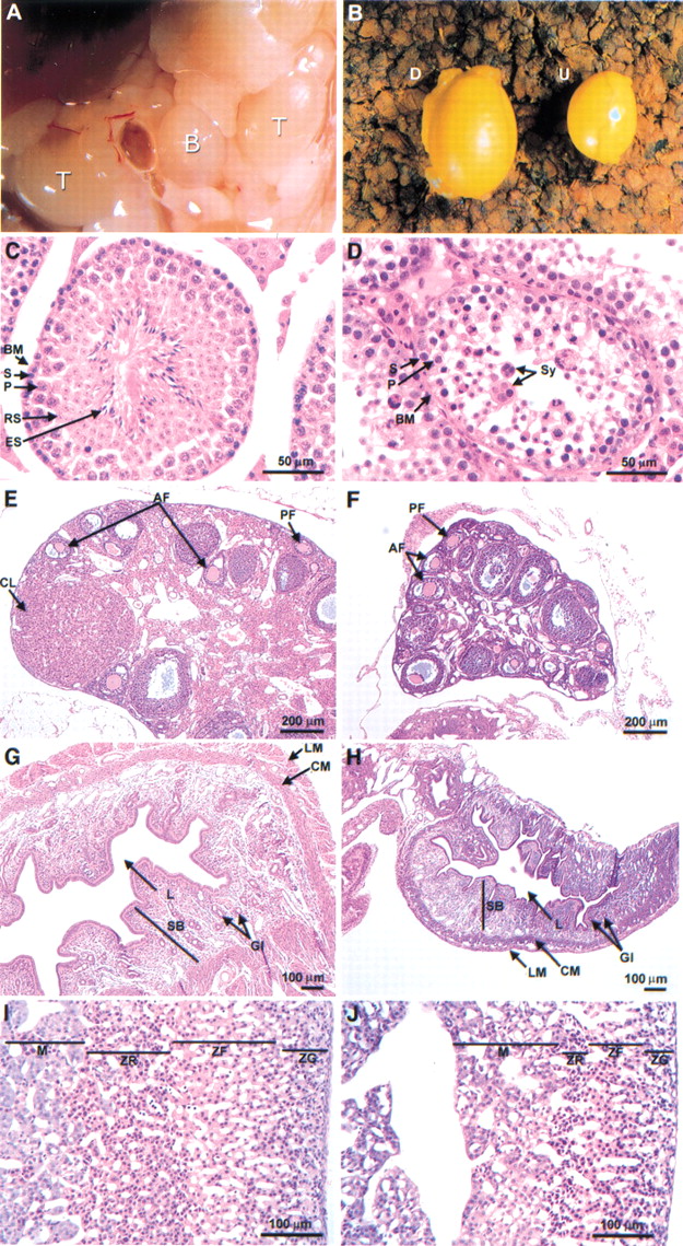 Pathology of the Desrt −/− mice. (A) Bilaterally cryptorchid testes of a 6.5-wk-oldDesrt −/− mouse. The undescended testes (T) are shown relative to the position of the bladder (B). (B) Descended (D) and undescended (U) testis, of a 6.5-wk-old unilaterally cryptorchid Desrt −/− mouse showing the smaller size of the undescended testis. (C,D) Histopathology of a 14-wk-old testis. Seminiferous tubules of a wild-type testis (C) densely packed with spermatogenic cells as compared with an undescended Desrt −/− testis (D) with disturbed spermatogenesis shown by the marked decrease in the number of germ cells, particularly the round spermatids (RS) and elongated spermatids (ES) and the presence of symplasts (Sy). (S) Spermatogonia; (P) primary spermatocytes; (BM) basement membrane. (E,F) Histopathology of a 4-mo-old ovary from a heterozygous mouse (E) showing normal follicular maturation as compared with a Desrt −/− ovary (F) showing the absence of corpora lutea. (PF) Primary follicles; (AF) secondary antral follicles; (CL) corpora lutea. (G,H) Histopathology of a 4-mo-old uterus from a heterozygous mouse (G) and the markedly smaller Desrt −/−uterus (H) showing thinner muscle layers, a reduced stratum basalae (SB), containing smaller glands, (G1). (LM) Longitudinal muscle; (CM) circular muscle; (L) uterine lumen. (I,J) Histopathology of 4-wk-old female (I) control and (J) Desrt −/− adrenal glands showing the severely diminished size of the zona reticularis. (M) Medulla; (ZR) zona reticularis; (ZF) zona fasiculata; (ZG) zona glomerulosa.