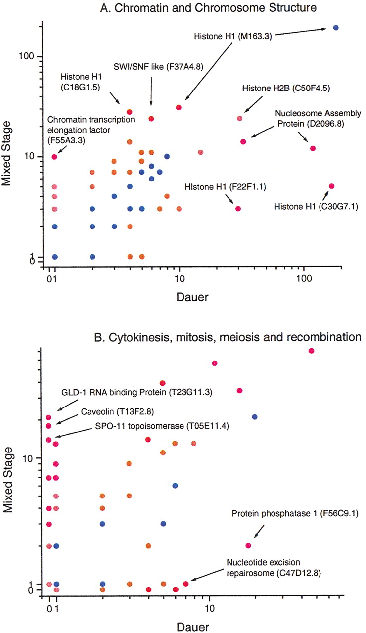Relative abundance of dauer and mixed-stage tags for genes from specific cellular processes (Costanzo et al. 2000). (blue) No significant expression difference between the two sets. (orange) Significance of P ≤ 0.05; (red) significance of P ≤ 0.01, as determined by the G test (Sokal and Rohlf 1995).